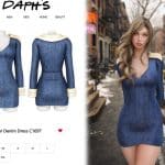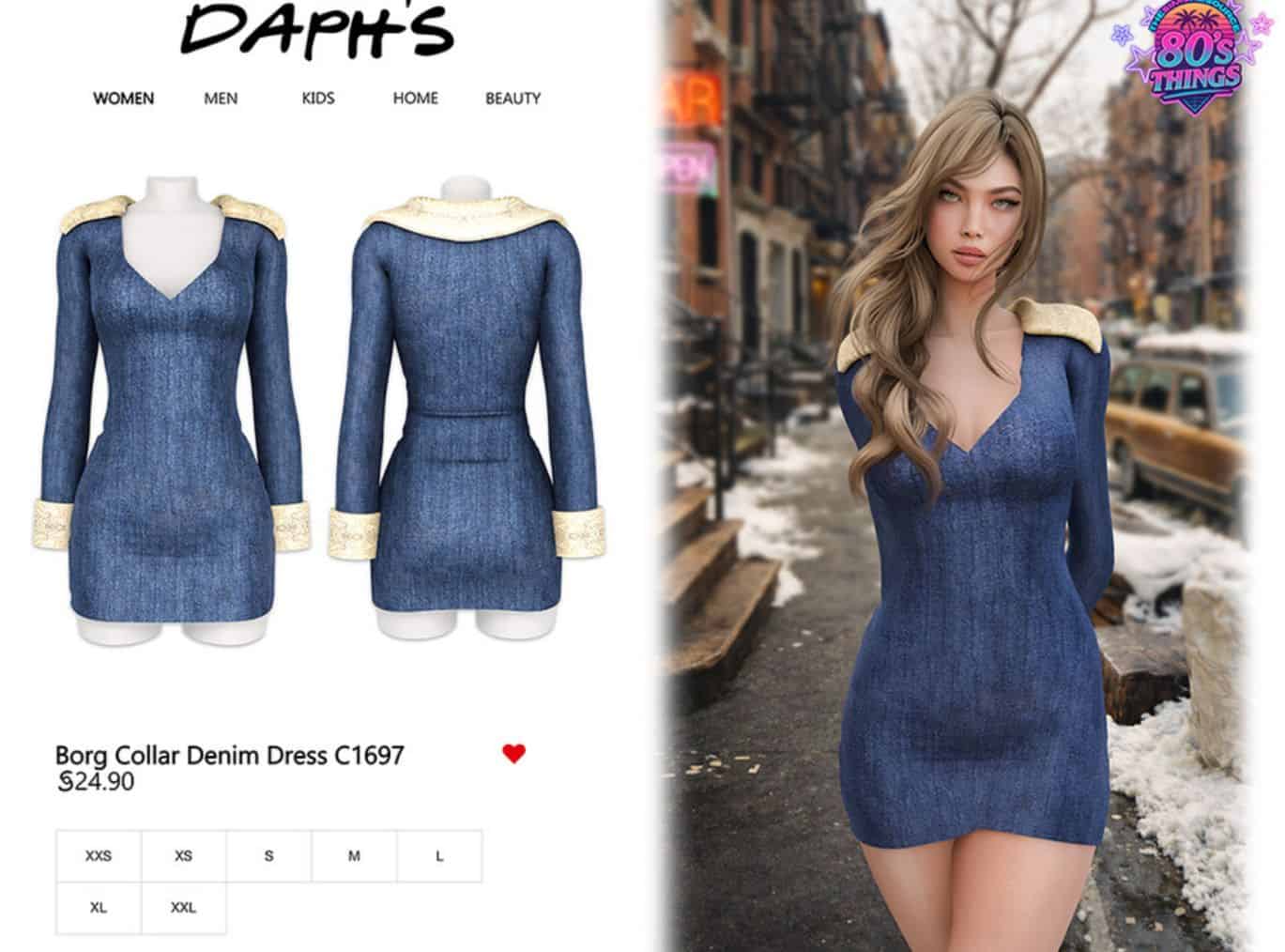 An 80s inspired fitted mini denim dress featuring a V-neckline, long sleeves, and borg collar details. Perfect for casual, vintage, and winter outfits.