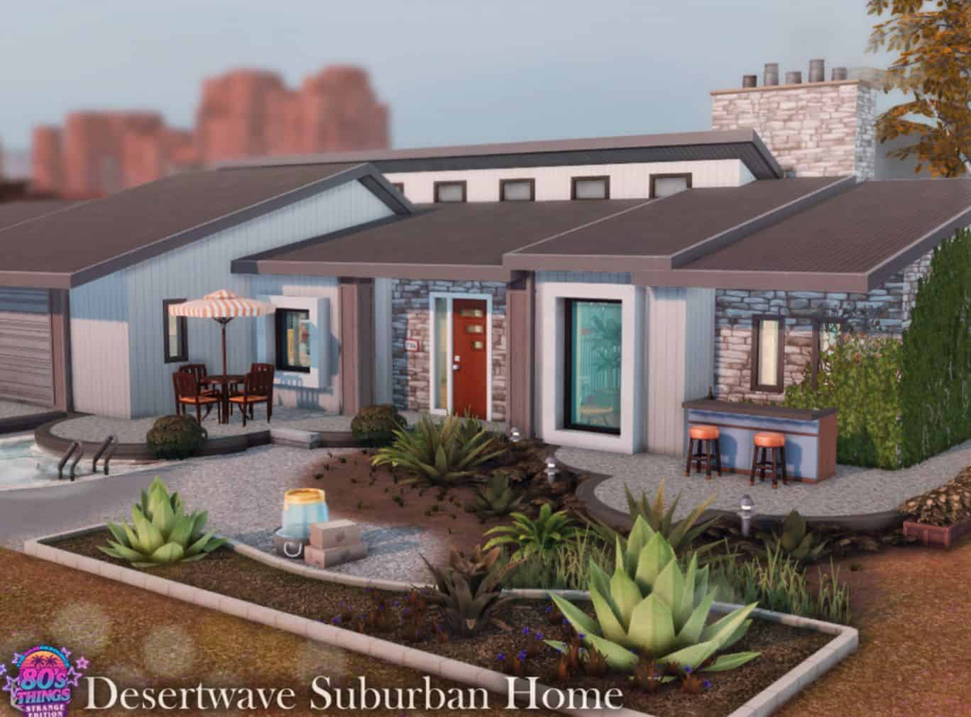 This house is a compact two bedroom, one bath home inspired by the warm, suburban aesthetics of the 1980s. Its low ranch style silhouette, wide garage, stone accents and clean geometric lines create an unmistakably retro look. Inside, you will find a cozy layout ideal for a small family or a couple living their best analog era life.