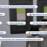 Once installed, go into the game, click on a Sim, and sort through the pie menu. You’ll see a pie menu called Sentiment Cheats. In that pie menu, you can either add or remove sentiments. Every sentiment that comes with the base game is included within four pie menus: Positive Sentiments, Negative Sentiments, Positive Romantic Sentiments, and Negative Romantic Sentiments. Romantic sentiments have been sectioned off so that they aren’t added by mistake to family members and such. Pick whichever sentiment you want and your Sim will have it toward the Sim you have chosen.