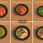 Indonesian food generally have Sambal option, therefore a lot of Indonesian food are served spicy. Sambal merah = red chili sauce, Sambal Hijau = Green cayenne chili sauce, Sambal Matah= Raw red onion chili sauce with red chili, shrimp paste, lemongrass and lime leaves. From Bali, province of Indonesia. The leaf is Daun Kemangi.