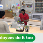 Employees, just like owners can “Ring Up” and “Ring Up at Register”. I didn’t specifically set a preference, so they might do both. I thought about making them only use “Ring Up at Register”, but I liked the variety in interactions. I did notice them going for the register more often but that’s EA’s default “do the less time-consuming / most rewarding thing”.