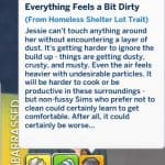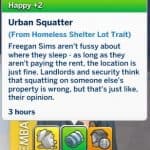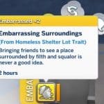-Homeless Shelter Challenge Lot Trait – Provided by the Sim City Dept. of Sim Services, shelters provide Sims with safety and protection from exposure to the weather. However, Sims may feel grungy and may become ill if they stay too long.