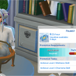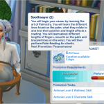 This custom career has one track and ten levels. It requires base game AND spa day, without spa day this career will not work as it utilizes the wellness skill. It does not have chance cards or rewards currently.