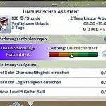 Focusing is of great importance here! From Monday till Friday, you work from 8 a.m. to 3 p.m. especially on your skills, namely Logic, Charisma, and – Guitar playing. Yes! Voice training also means singing, and to stay professional, you should master at least one instrument to accompany the singing client with all power you got. And you might be inspired to do so because of the 180 Bucks per hour that you earn with it. You will gain in self ensurance. For sure. And after that, you may continue as a