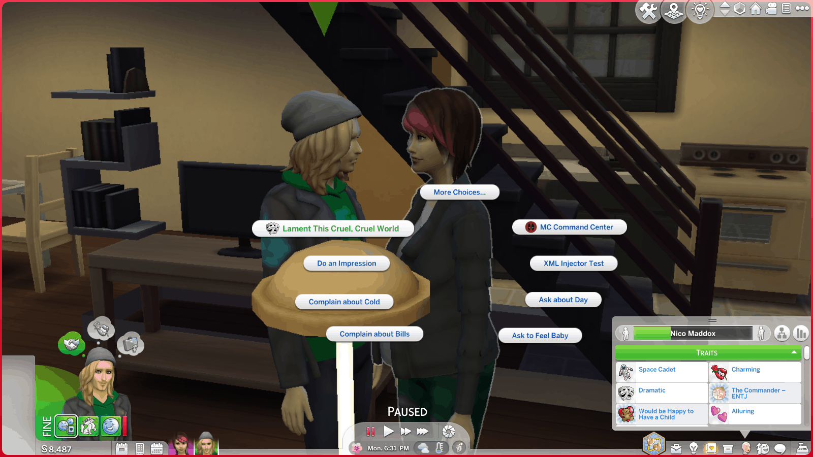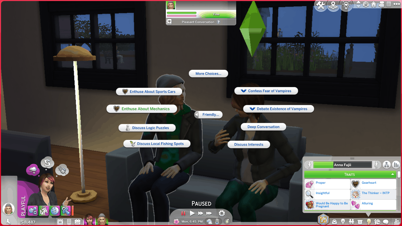 These sims build logic faster than most sims. They have 2 unique socials, including “Ask Insightful Question” which has a high chance of letting the sim learn one of the other sim’s personality traits (note: only works with base game traits and traits included in this pack. If I can figure out how to program it to include other custom traits I will change it, but currently I don’t know if that’s even possible.) They lose social need a little faster than most sims. This is a teen through elder trait.