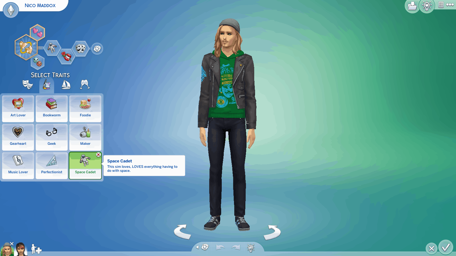 These sims adore anything related to space! They have small boosts to learning logic and handiness, but a large boost to learning rocketry. They have 4 unique social interactions. They randomly become inspired by thinking about space. They get especially focused when building rocketry skill and get especially happy about whoo-hooing in space. They get whims related to rockets. This is a teen through elder trait.