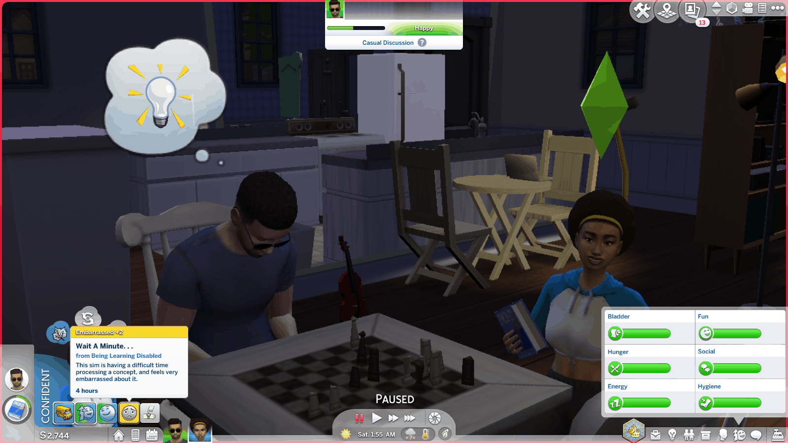 These sims are slower to learn all mental and social skills. They are slower to build grade school, high school, and career performance. They get random embarrassed and stressed moodlets related to their difficulties, and get especially confident when they do well in school and chess. They get whims to get confident, do homework, do extra credit work, and talk about school. This is a child through elder trait. Note: see disclaimer at the bottom of page regarding this trait.