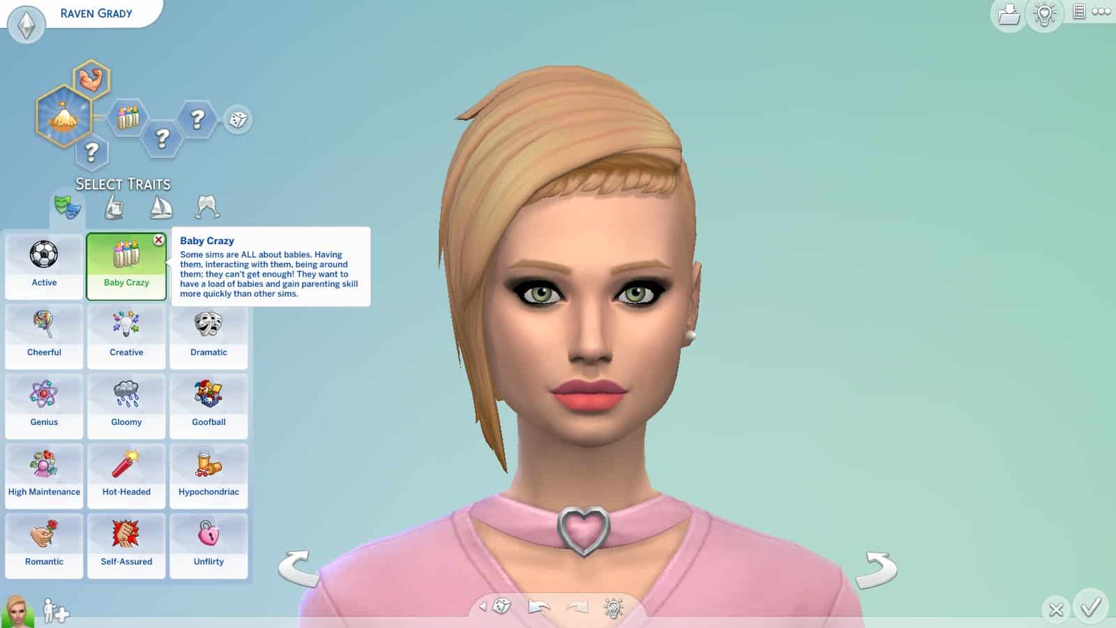 8 Custom Traits; Baby-Crazy, Lusty, Shy, Night Owl, Morning Person, Cool, Witty, Film Buff