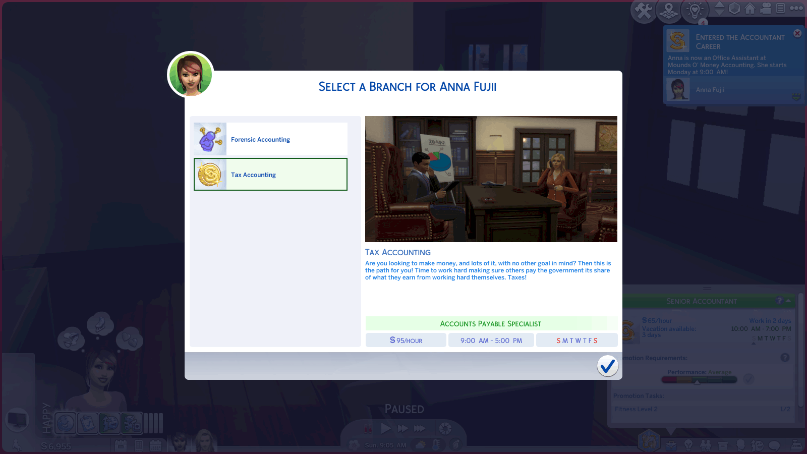 This is a rabbithole accounting career with two branches, Tax Accounting and Forensic Accounting. Completing either branch will result in a unique reward trait. Tax Accounting reaps more financial rewards, but Forensic Accounting helps your fellow man by bringing criminals to justice, so you have to choose your particular motivation for pursuing accounting in the first place.