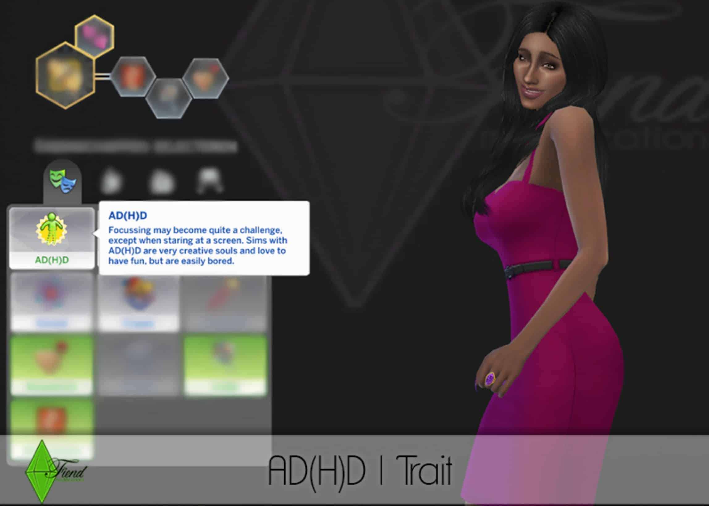 A trait for your Sims to make life just a little bit more of a challenge. Especially challenging for kids and teens, this AD(H)D trait interferes with your everyday schoolwork. The trait does NOT replace any other trait.