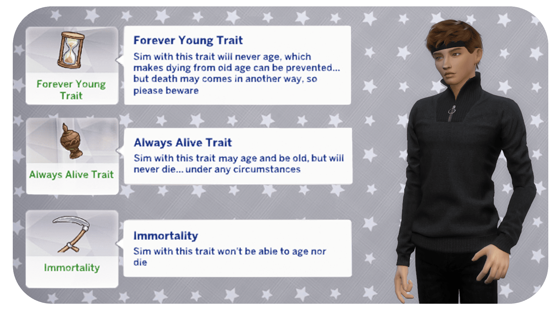 Note : If you give a sim Forever Young / Always Alive trait by interactions, they can only be removed with interactions as well, instead from CAS. This happens because the interactions will give sims ‘reward’ traits type, instead of CAS personality traits type