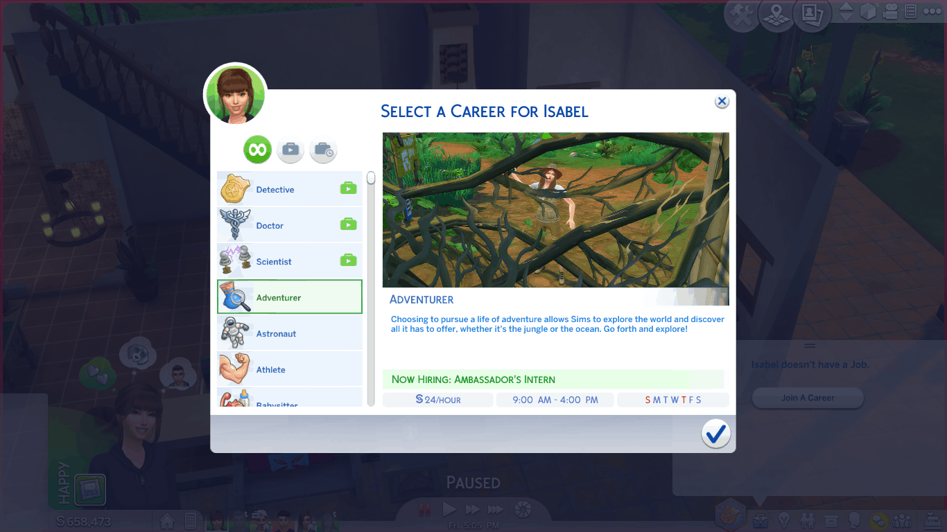 This career is based off the Adventurer career from the Sims 2. It’s similar with some minor changes in salary and skills needed per level. It utilizes the Fitness, Handiness, Charisma and Archaeology skills. It does not have any chance cards or daily tasks etc.