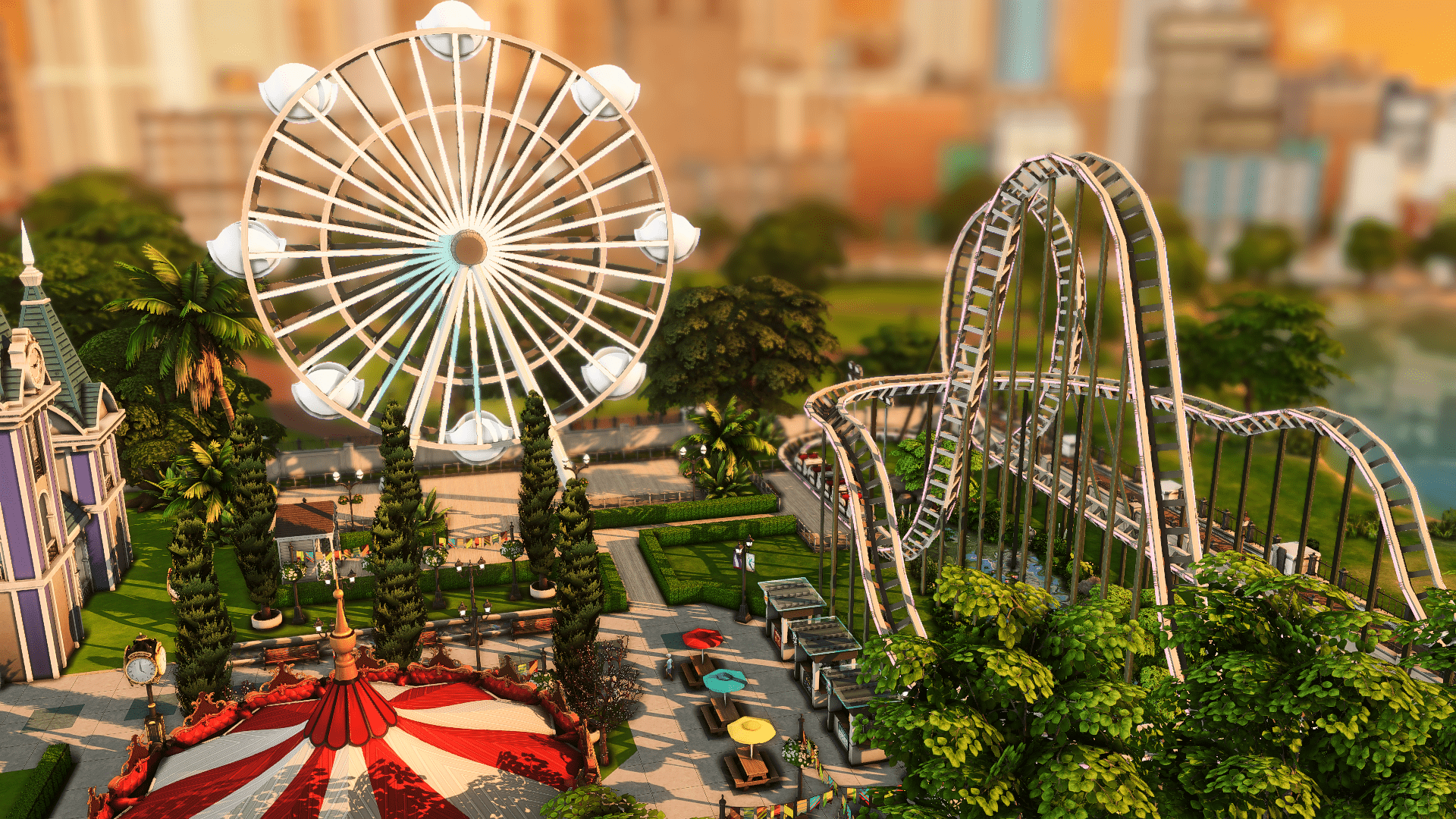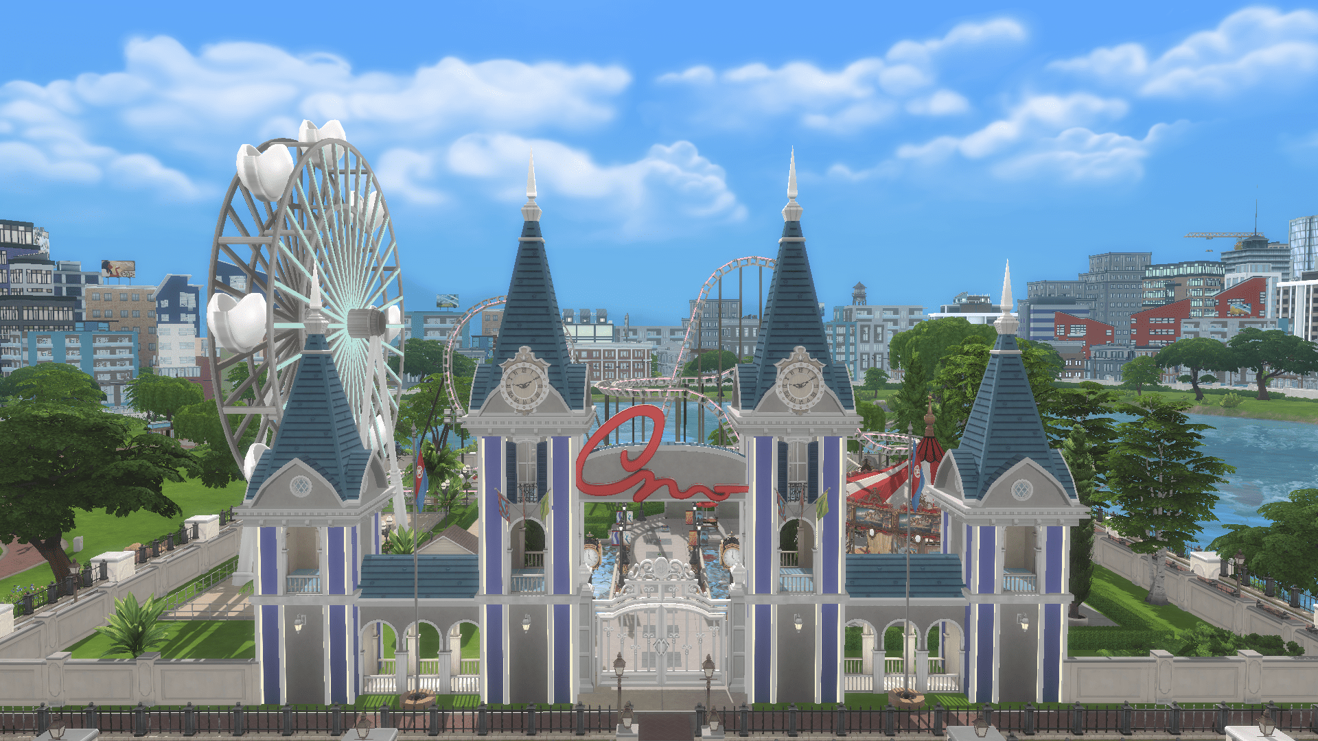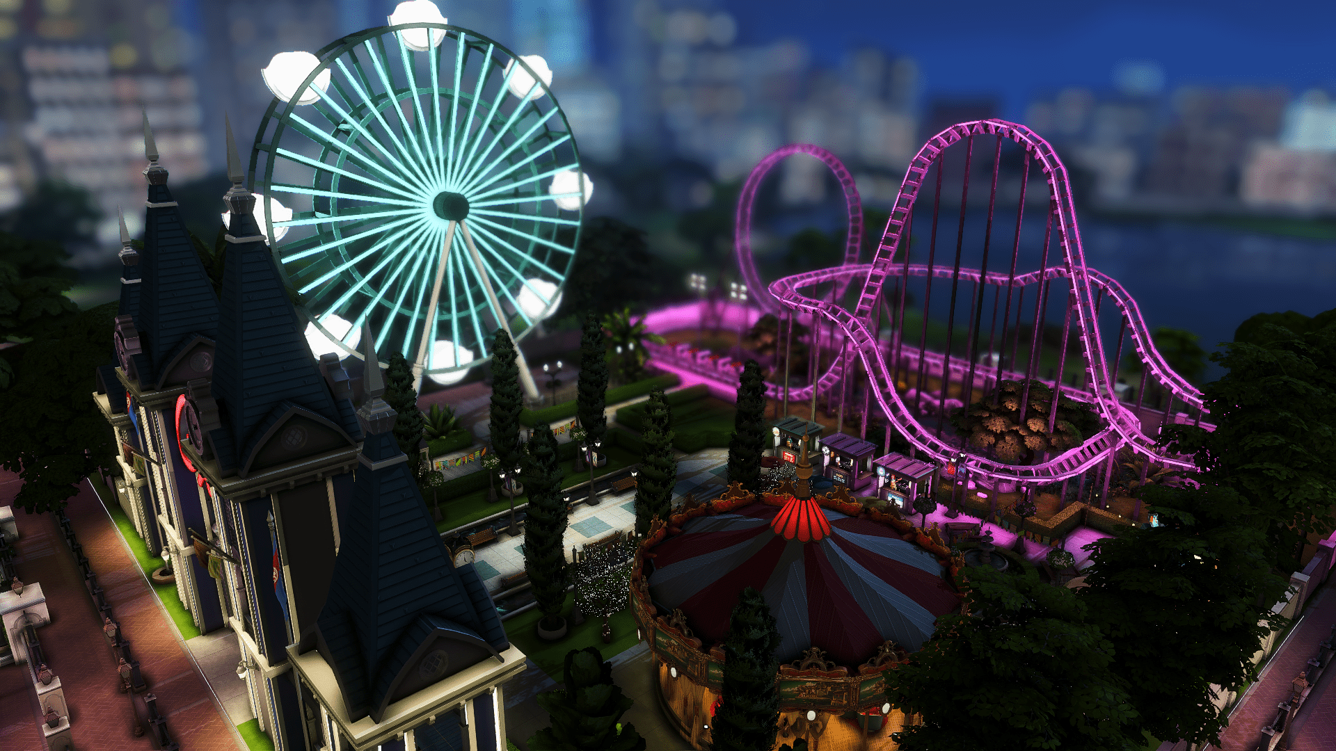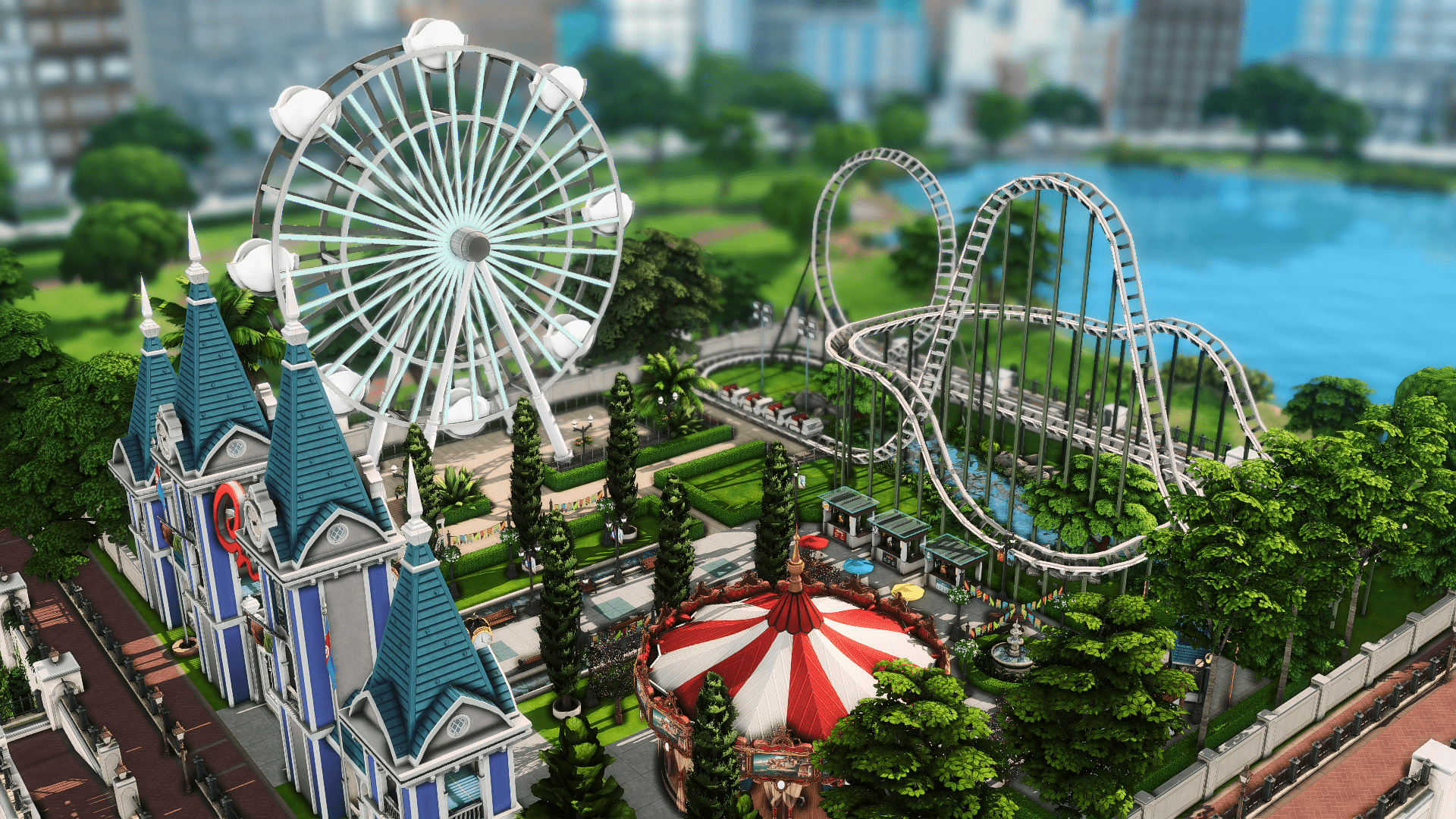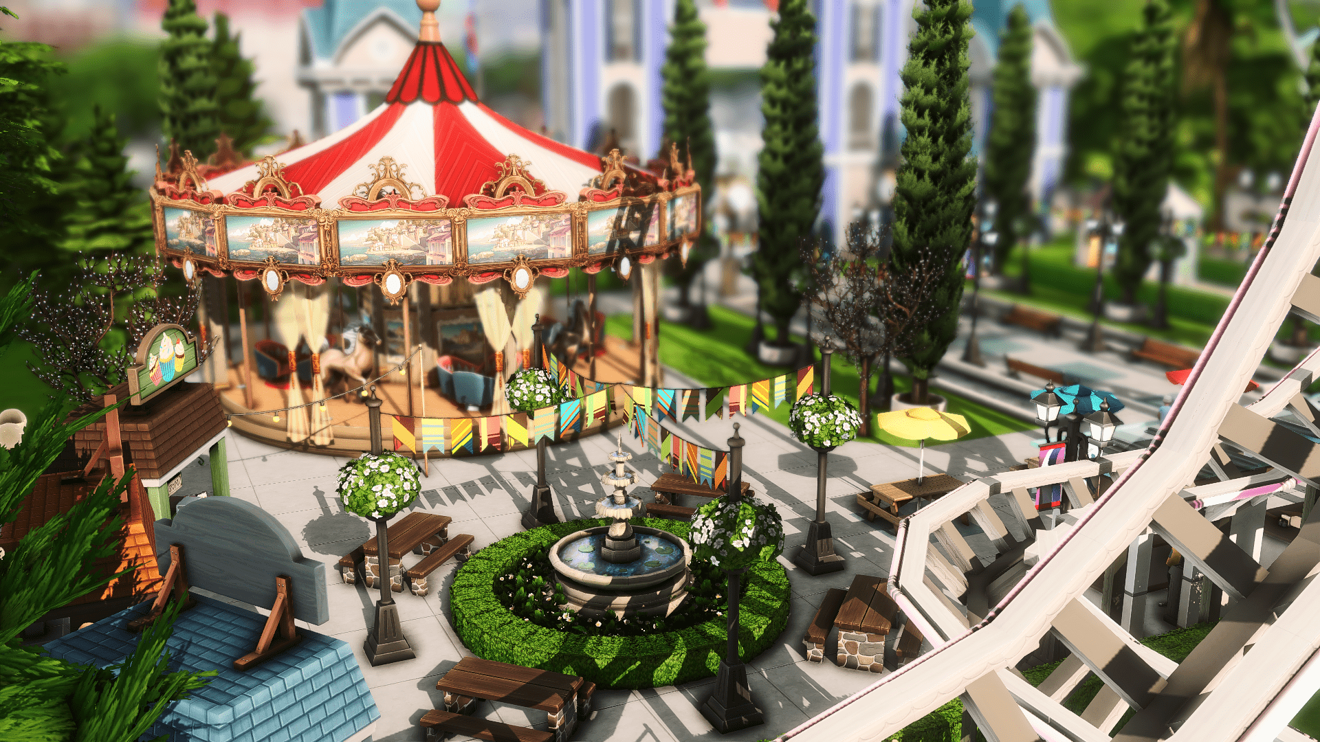 Enjoy the best family moments in this huge amusement park in the center of San Myshuno. You’ll love to have this view dring the night with all the lights on. The Rollercoaster, ferris wheel and carroussel are not functional since they were built using only objects that we have in game. The park has a food court and a bathroom but the rides are only contemplative. Hope you enjoy!