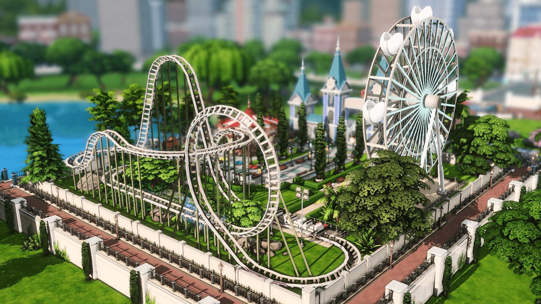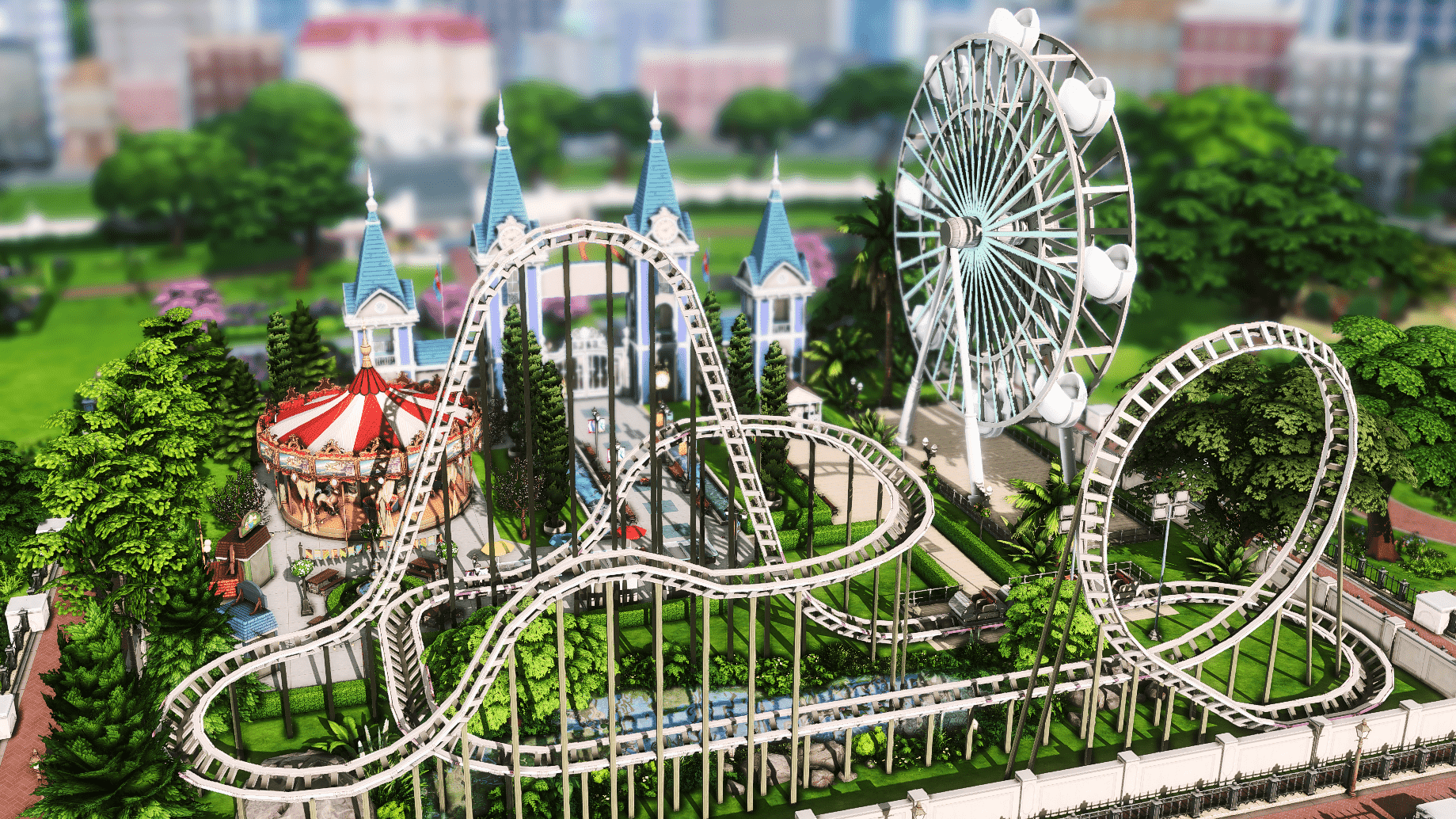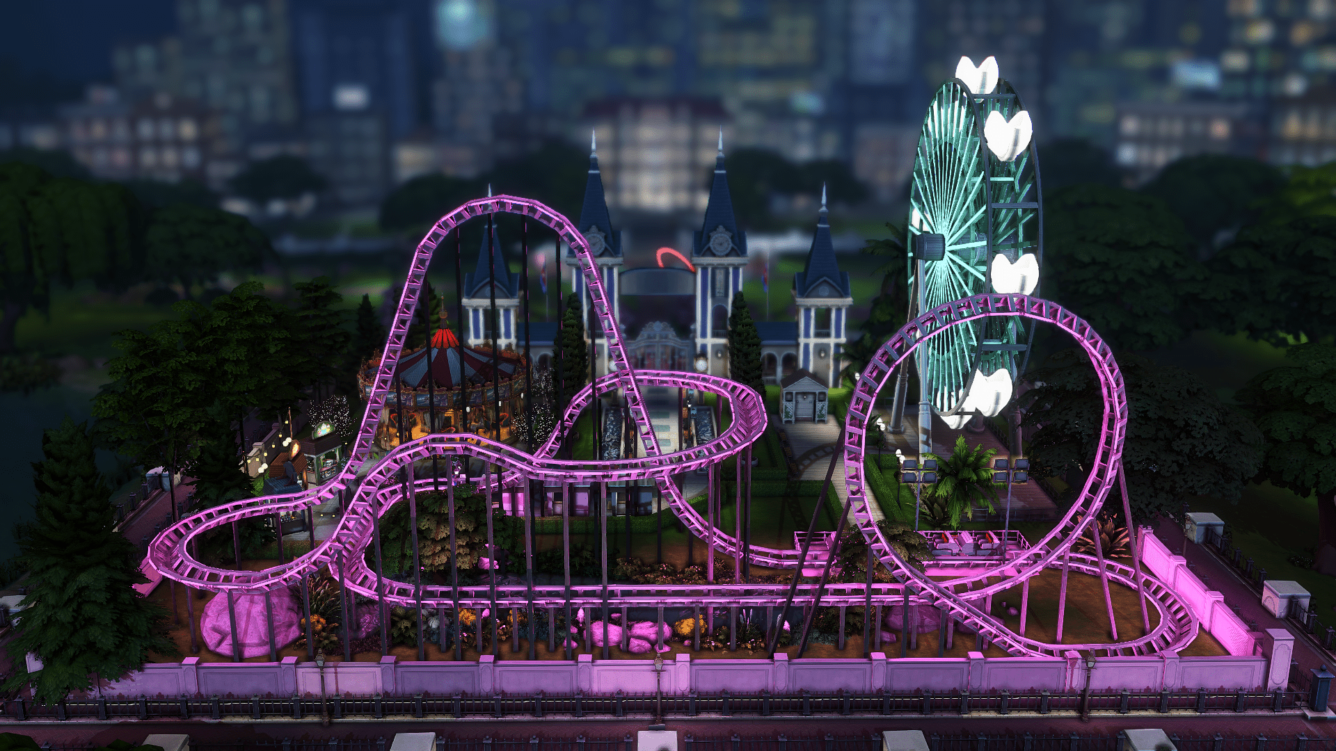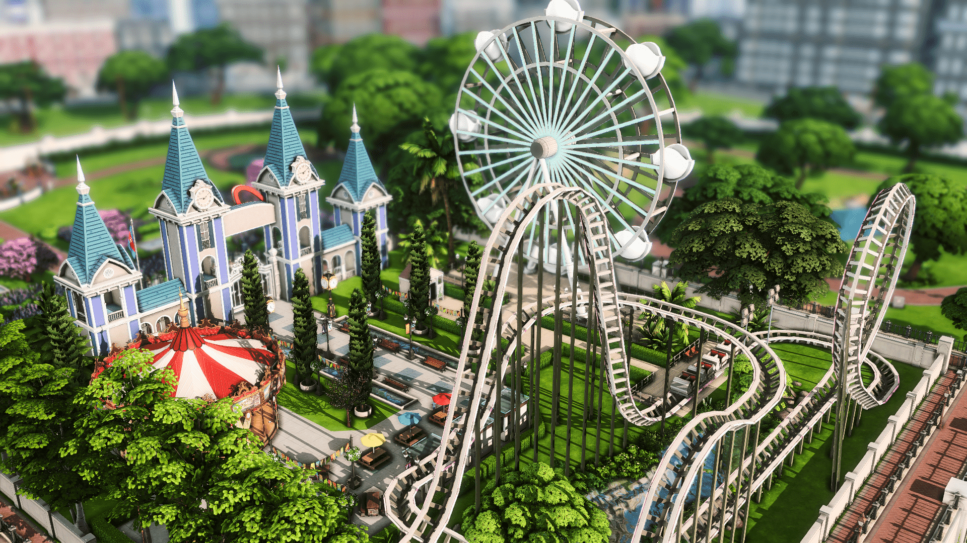 Enjoy the best family moments in this huge amusement park in the center of San Myshuno. You’ll love to have this view dring the night with all the lights on. The Rollercoaster, ferris wheel and carroussel are not functional since they were built using only objects that we have in game. The park has a food court and a bathroom but the rides are only contemplative. Hope you enjoy!