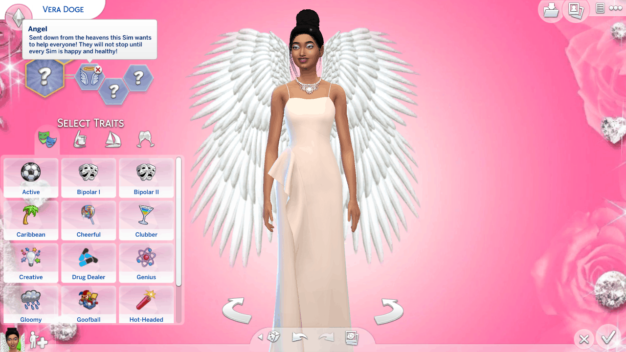 I completely redid this trait. It now has occasional buffs relating to the doctor career and vet career because I see an angel as someone who would have came to the Simsverse to do. It was something I wanted to do original but didn’t know how. However with the new test version of Mod constructor it was easy to figure out how to do. Plus I actually read the tutorial