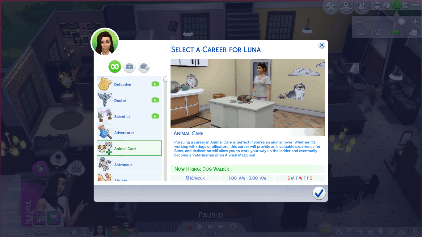 Pursuing a career in Animal Care is perfect if you’re an animal lover. Whether it’s working with dogs or alligators, this career will provide an invaluable experience for Sims, and dedication will allow you to work your way up the ladder and eventually become a Veterinarian or an Animal Magician!