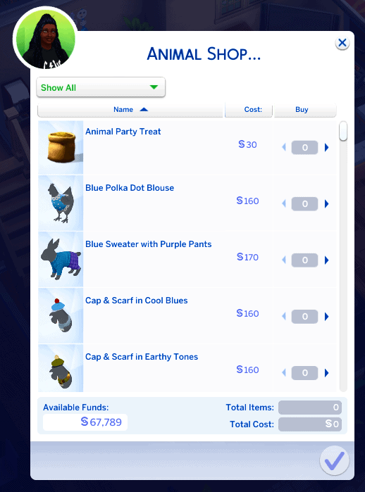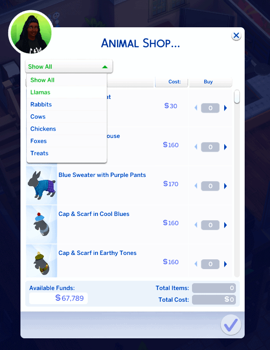 “Animal Shop” has decided to open up for all Sims who has phones (you do have phones right? Right?) With a click of your thumb you are now able to buy all the clothing for all our dear animal friends. Llamas, Cows, Chickens, Rabbits, yes even the sly Fox! And if you are feeling particularly fancy you can even buy them a treat or two or 8794579804 (just don’t complain if your Llama can’t enter the barn). Spoil your furry friend with fancy clothing and treats!