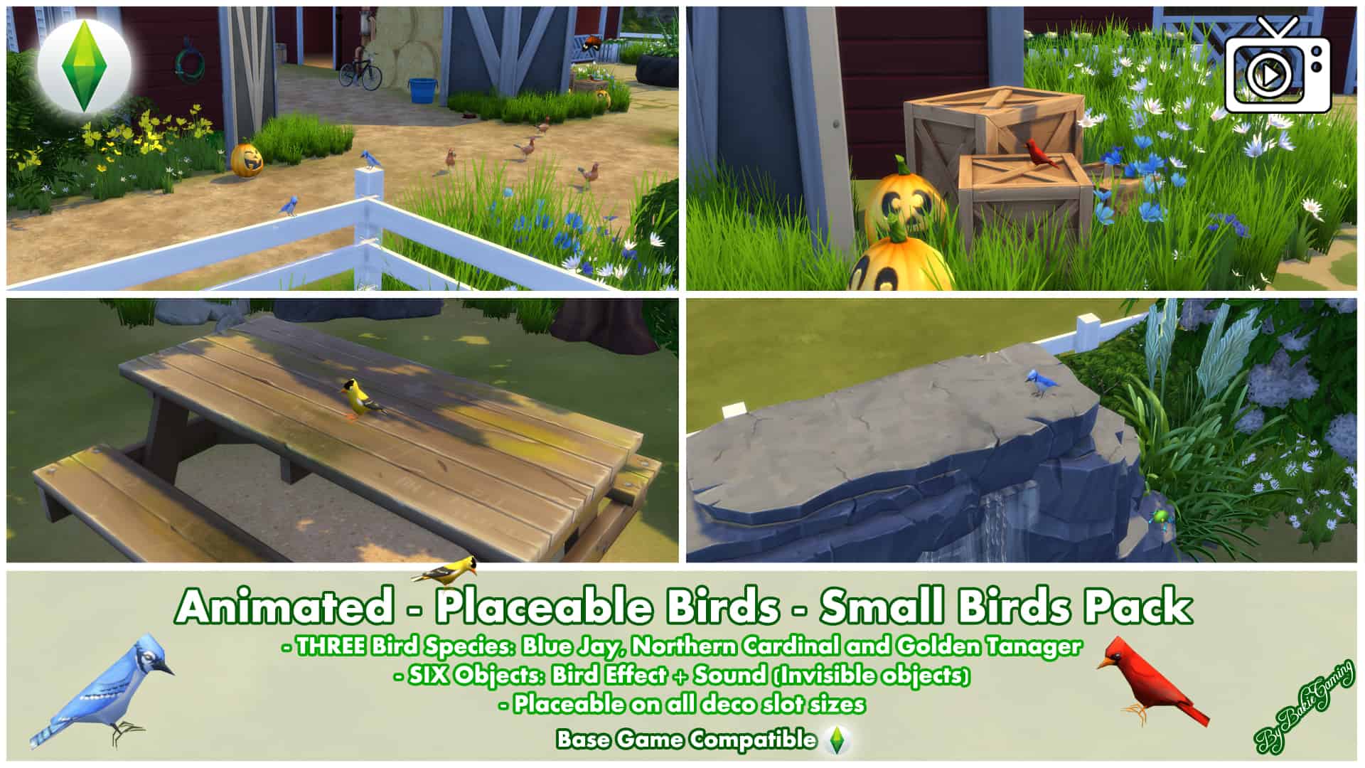As for the objects, you will find 2 objects for each bird. One object will spawn the bird just looking around and on the other one will spawn a bird looking around and eating.