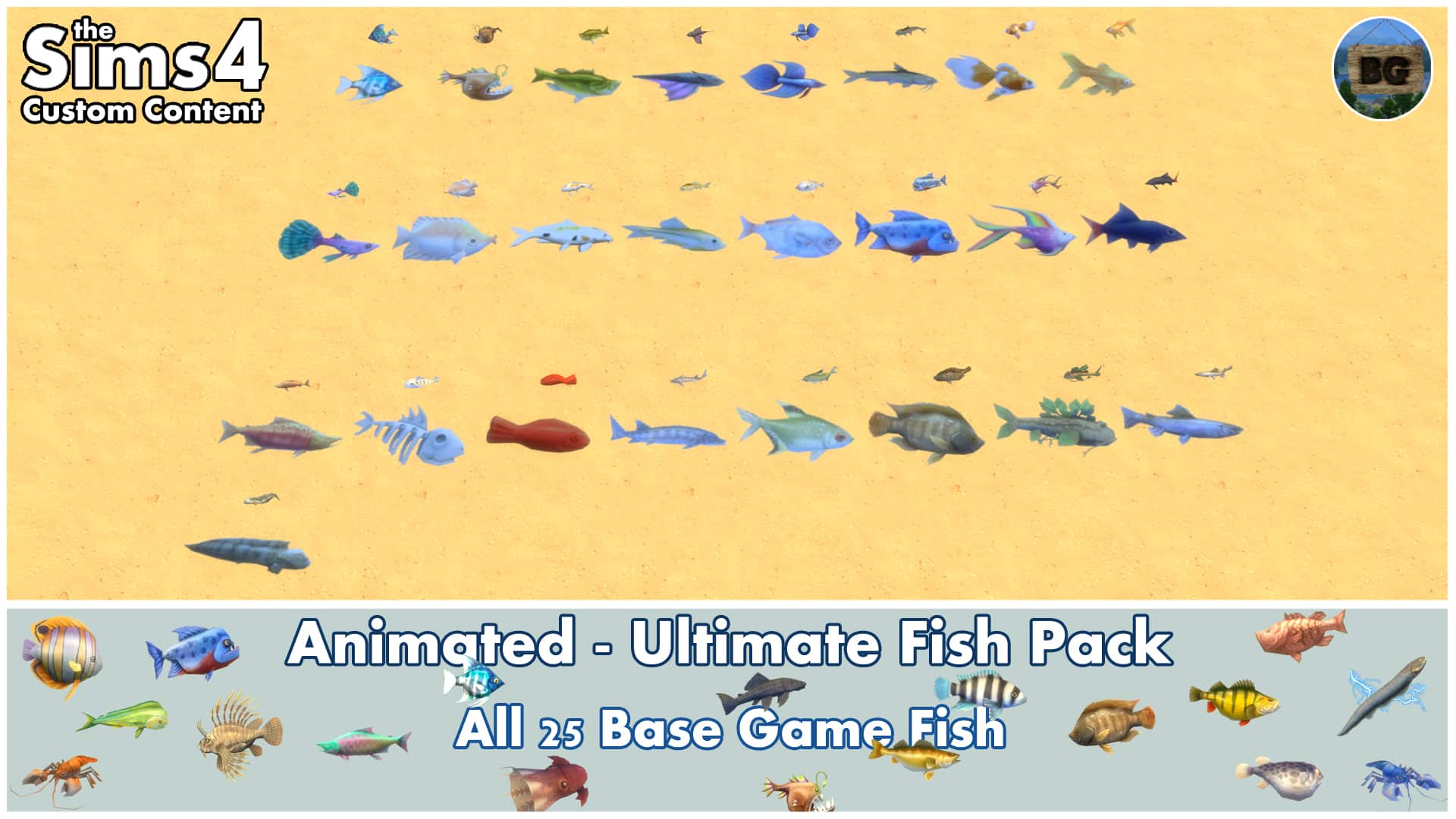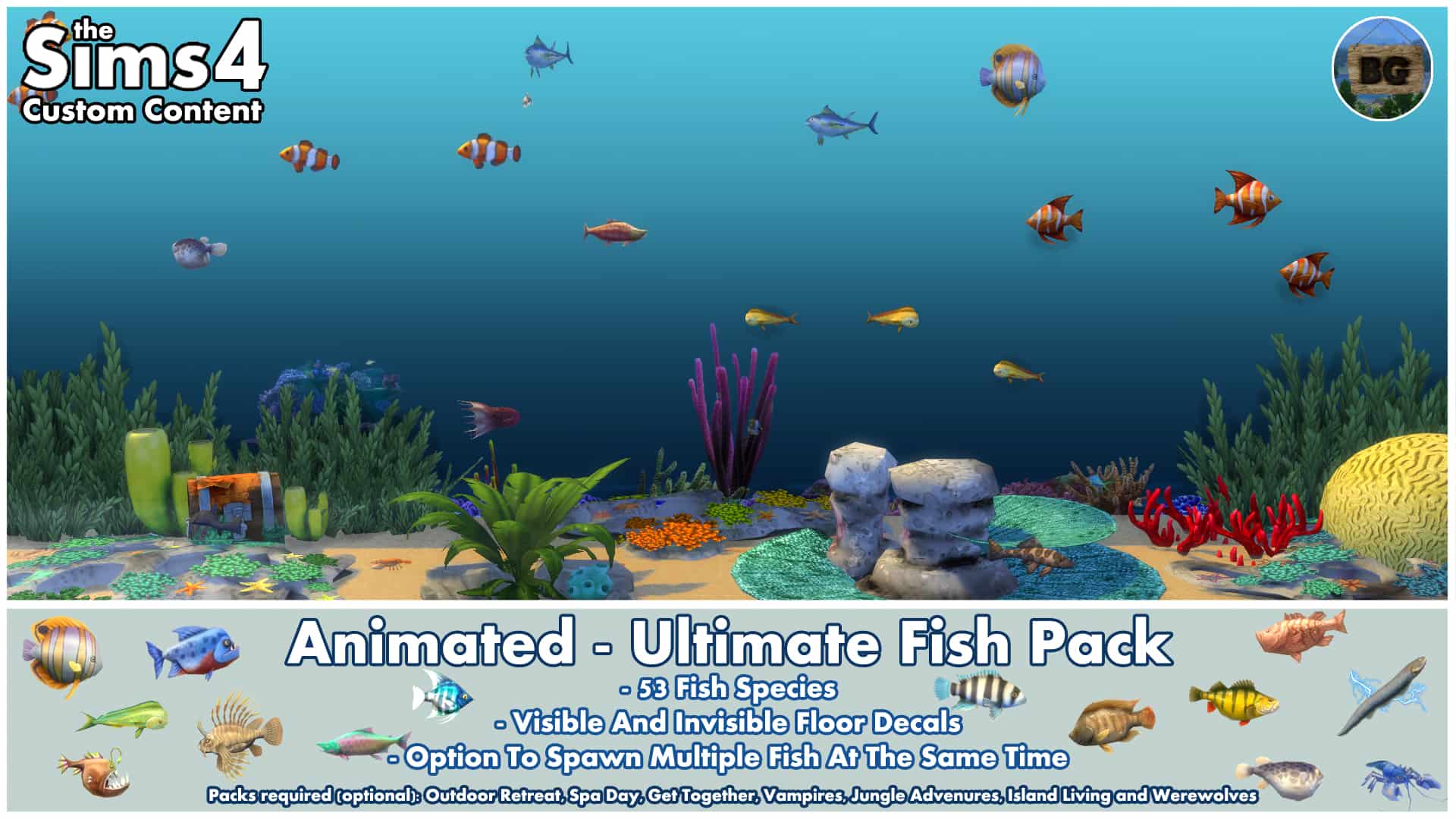 By downloading the Ultimate Fish Pack, you will get all 53 fish species that are part of the game right now. This time though, with the help of the wonderful RAVASHEEN, I was able to make all 25 Base Game fish, to be actually Base Game compatible. for the other fish, you will still need the packs they came from.