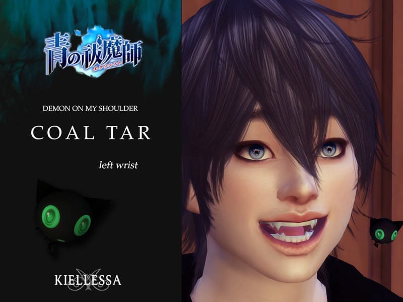 Ever wanted a demon on your shoulder? Now you can! Adorable little Coal Tar (from Ao no Exorcist) that hovers above the Sim’s left shoulder and is equipped as a left wrist accessory for teen-elder.