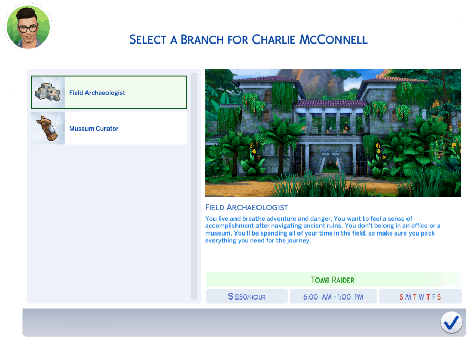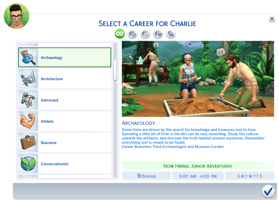 Your goal is to forage the forests and jungles and brave the danger in order to make discoveries to share with the Historical Society. Yes, you’re taking on the most danger and earning the least pay, but you’re out scouting on the front lines and making the initial discoveries. You know, that’s enough for some Sims.