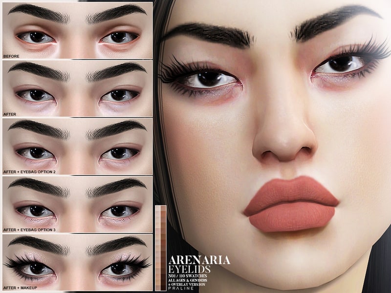 I made 3 versions which all differ with how the eyebags look, all of them come in 30 colors + 5 different overlay versions (yes, adapts to maxis skin colors), also every one of them has 3 different transparency levels included.