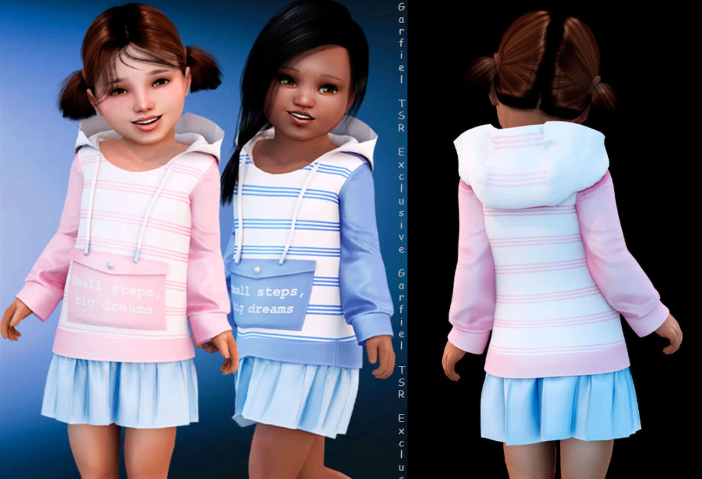 A cozy and stylish hoodie dress featuring a striped pattern, an oversized hood, and a cute pouch with the phrase “Small steps, big dreams.” The layered skirt detail adds a playful touch, making it perfect for a casual yet trendy look.