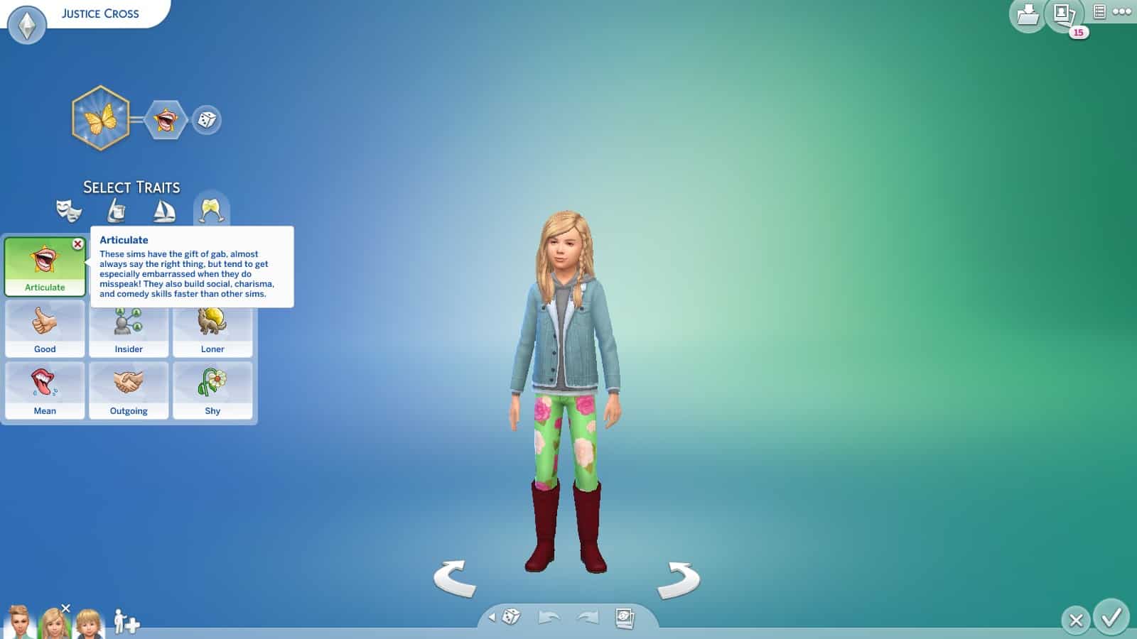 Articulate sims also put other sims in a good mood just by talking to and being around them with a +1 Happy moodlet. They gain positive moodlets when social interactions go well and when building the related skills. They gain negative moodlets from social interactions gone awry. Their whims include wanting to interact with people, make friends, call on phone, chat, build social, build charisma, build comedy skills. This is a child through elder personality trait.