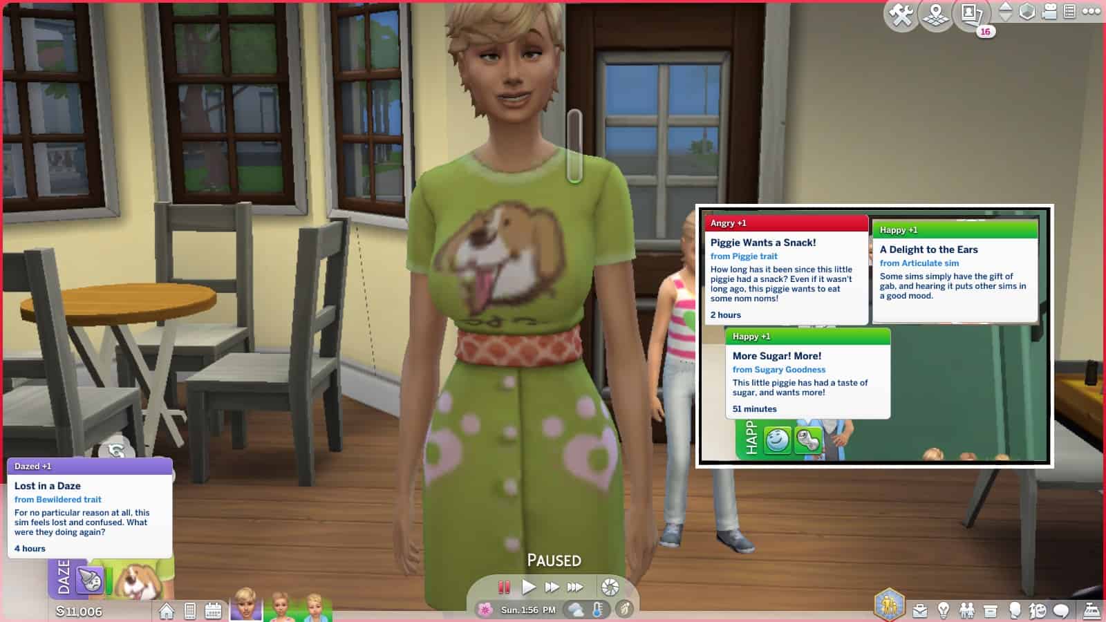 I felt that toddlers often get neglected when it comes to custom traits, so I created the trait Piggie for that life stage. These toddlers are spoiled and love to eat and make messes! They will act out in ways similar to Wild toddlers, by wanting to run around and take off their clothes, and will want to eat even when they aren’t hungry. They will even get angry moodlets and throw tantrums over wanting to snack. They react even more negatively to hunger than other toddlers. They will become Happy instead of Energized when eating sugary treats. I chose to modify toddlers this way to include more physical variation because unless they have an extremely overweight parent, my sims always grow up very slim, which isn’t necessarily realistic. Hopefully this trait will lead to adorably porky children and add some additional dimension to the game. This is a toddler trait only.