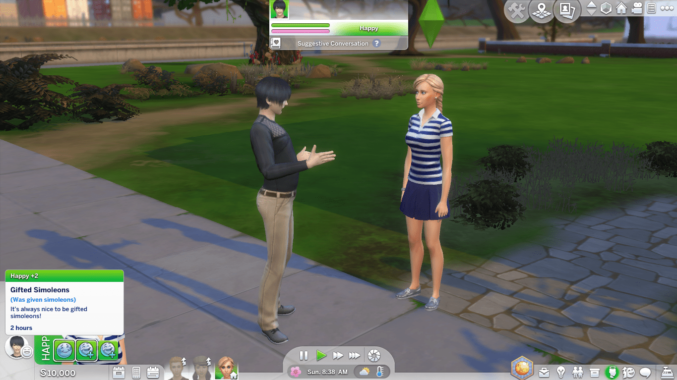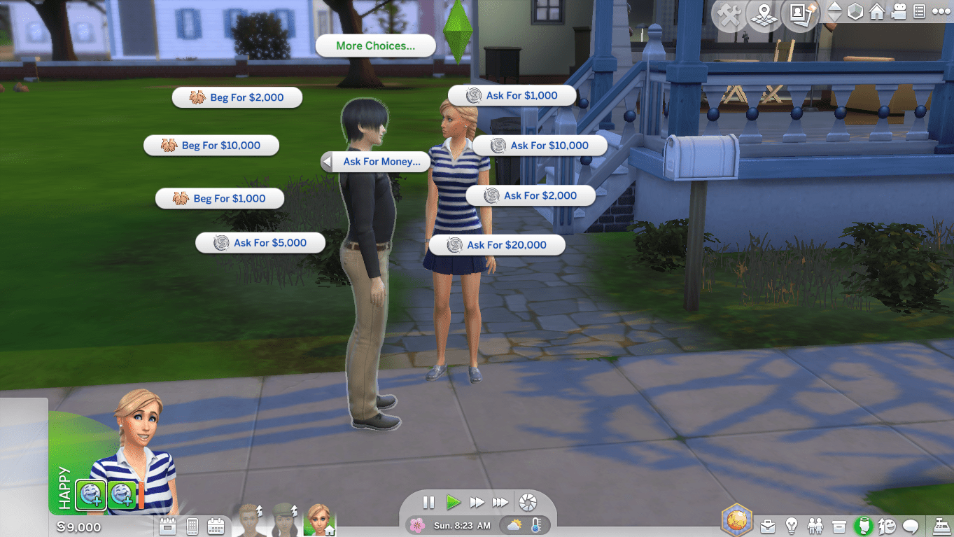 When available, if the selected sim clicks on another sim, the pie menu appears along with the interactions kept inside. The options grant simoleons of the value they display. For example, the interaction “Ask For $2,000” will add $2,000 to the active sim’s household.