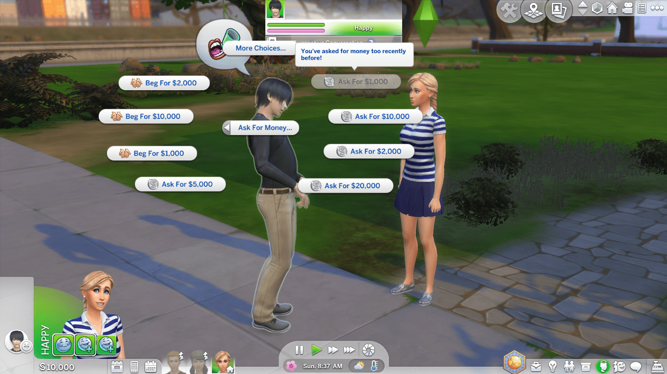 Sim Value: To be able to give money, the sim you ask has to have the amount to do so. For “Ask For Money” interactions, the sim you are asking has to have 10x the amount in simoleons. (Realistically, who would give away all the money they have? So it’ll be a tenth.) For “Beg For Money” interactions, the sim only needs 5x the amount. Attempting to ask for $5,000 would require the other sim to have $50,000 ready, or $25,000 if you choose to beg. A notification appears if the picked sim doesn’t have the funds and no money will be given to your household.