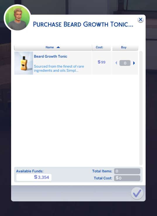 If a sim can’t wait for their beard to grow in, they can order Beard Growth Tonic found on the computer under “Order…”. Be cautious as sim pharmaceuticals has not properly tested the tonic and it may cause side effects if not consumed properly…