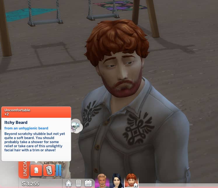 Growing a beard comes with challenges, namely that of almost unbearable itchiness!! After a few days of stubble, sims with low hygiene may start to feel itchy and a bit miserable. A trim, shave, shower, or bath will bring much relief.