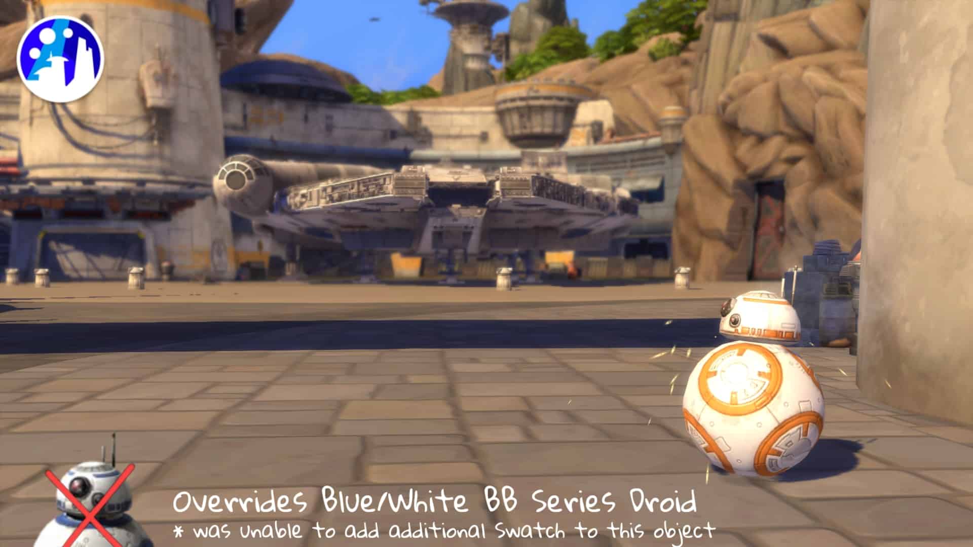 This Package will override the Blue/White head and body swatches of the BB Series Droid in Journey to Batuu with the Orange/White the colours of BB-8.