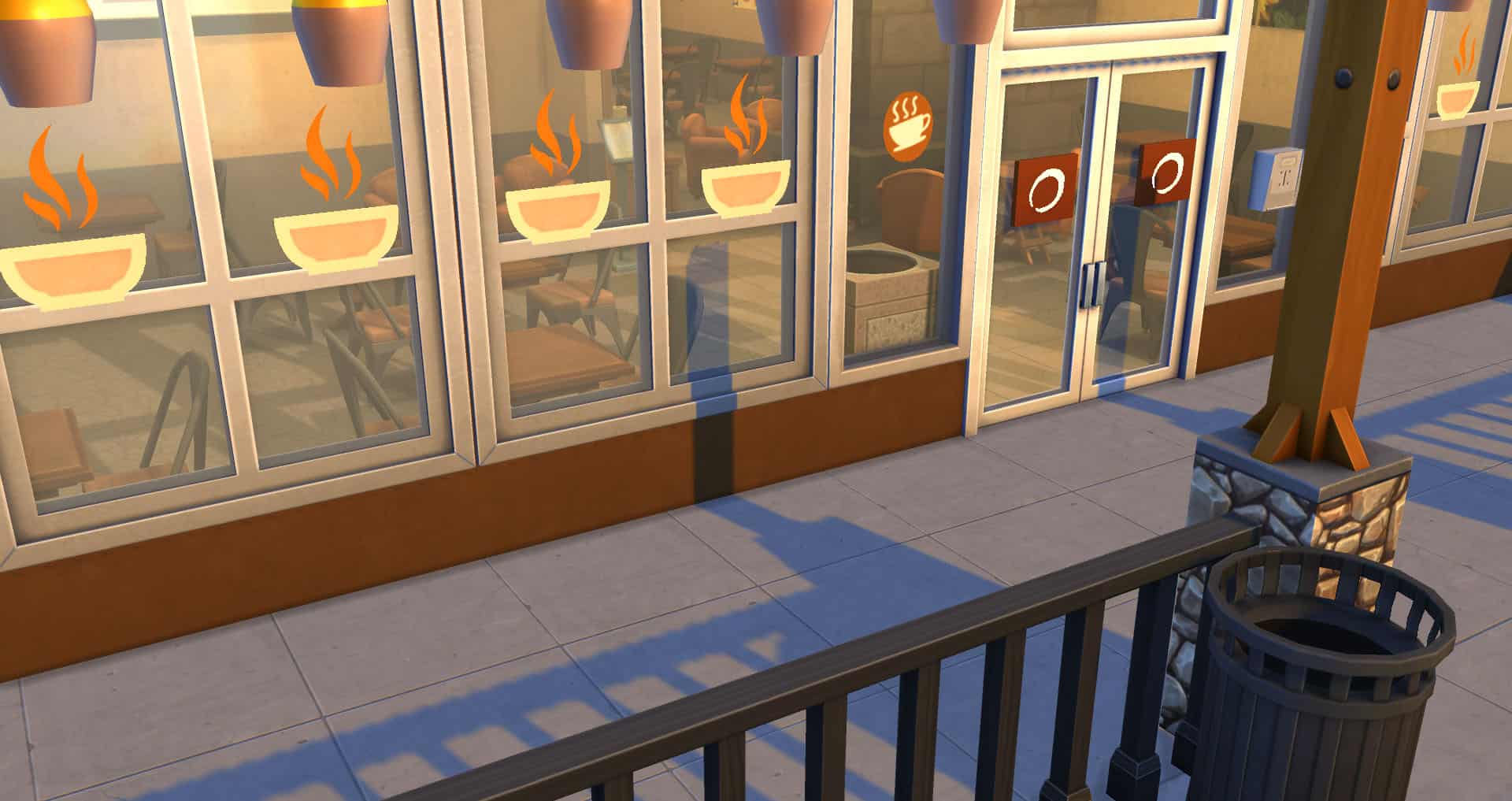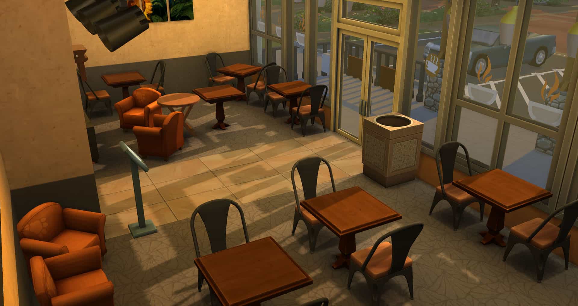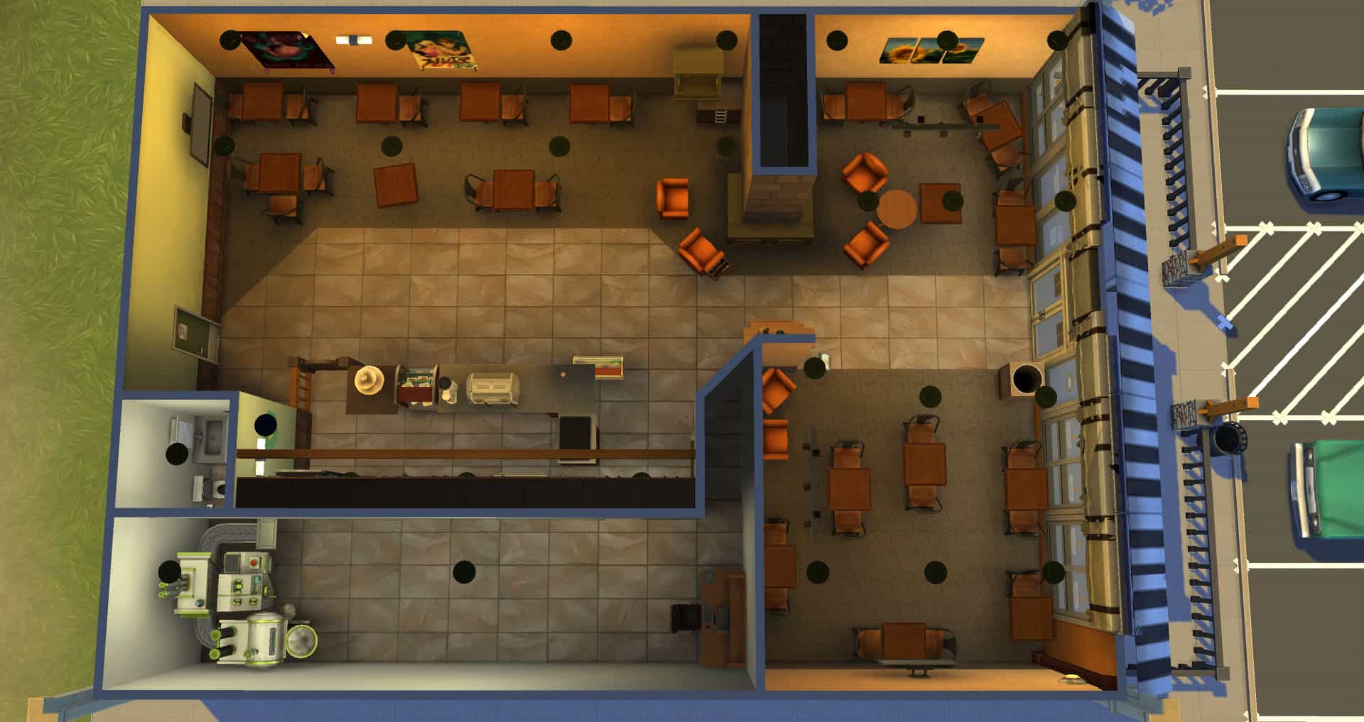 Routing: This lot contains fewer tables and chairs than the real life store, as Sims had a devil of a time navigating a more accurate version of the floor layout.