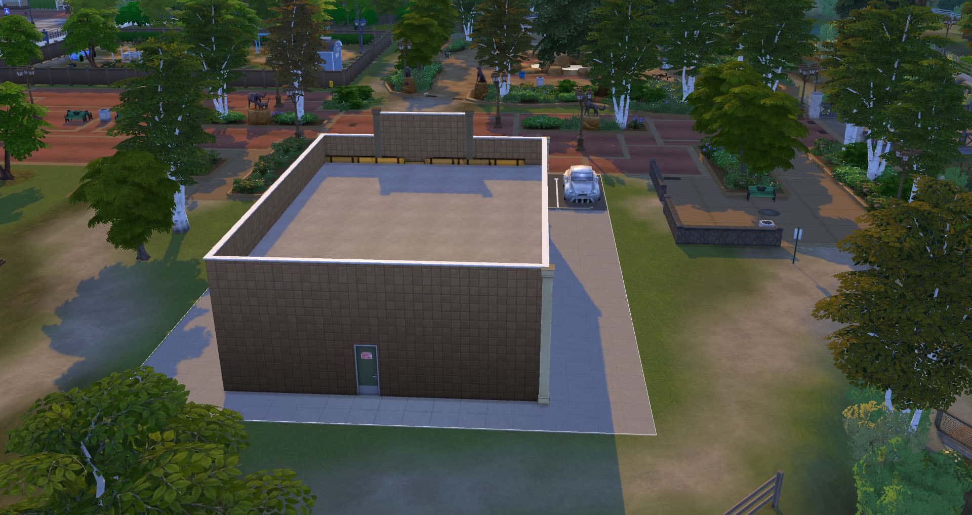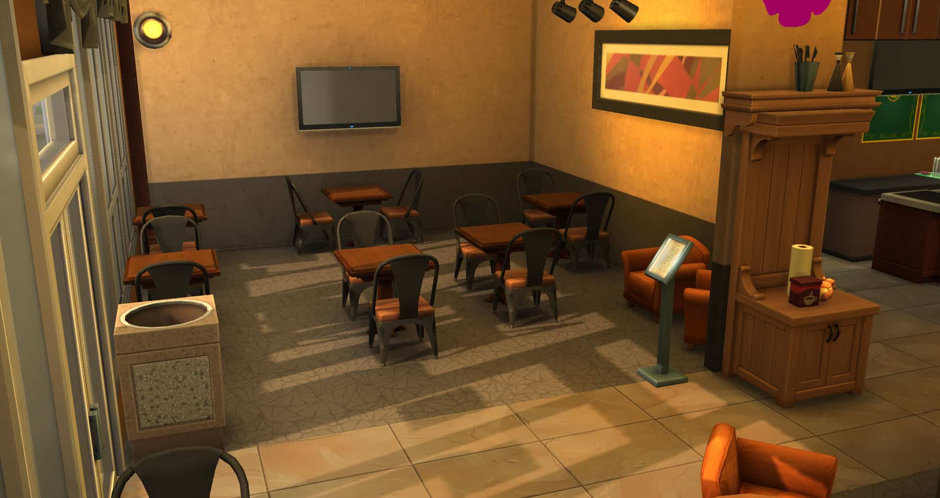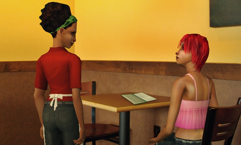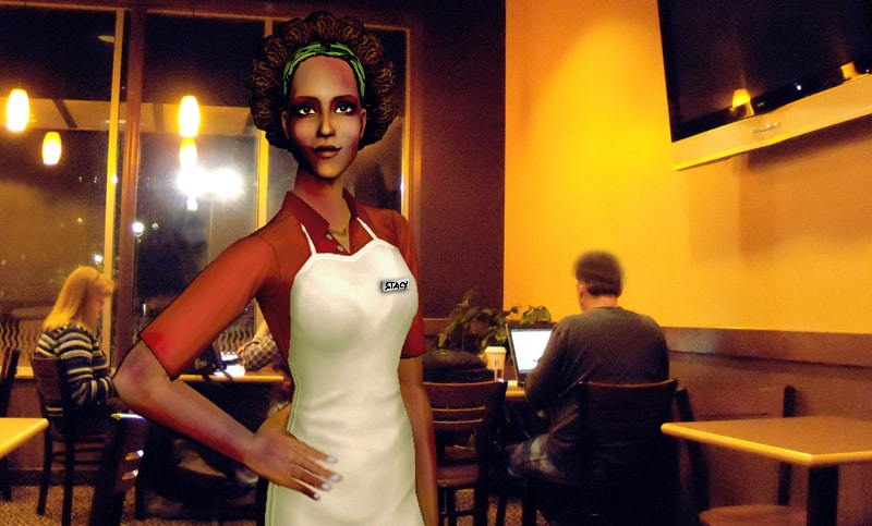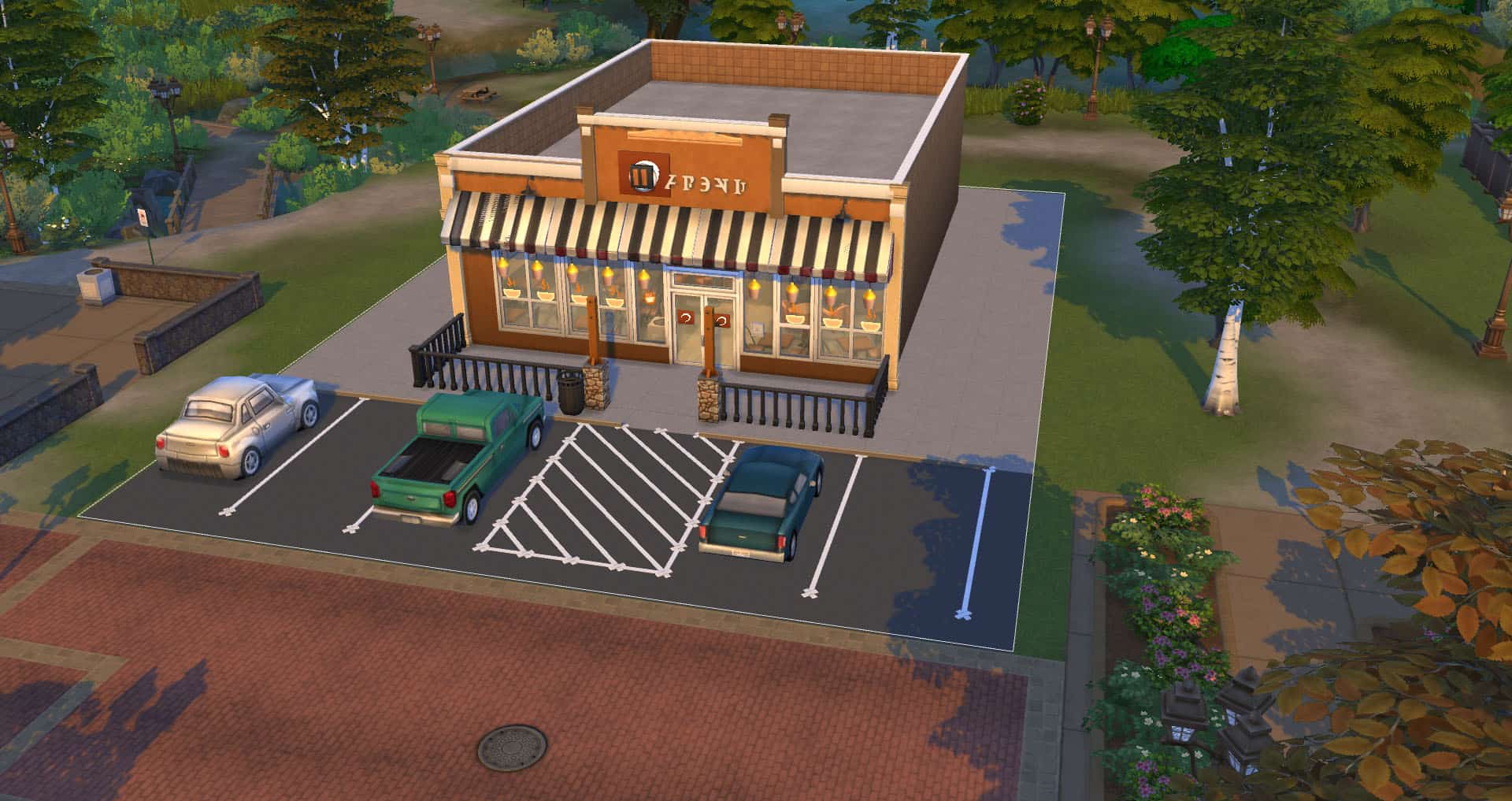 Routing: This lot contains fewer tables and chairs than the real life store, as Sims had a devil of a time navigating a more accurate version of the floor layout.