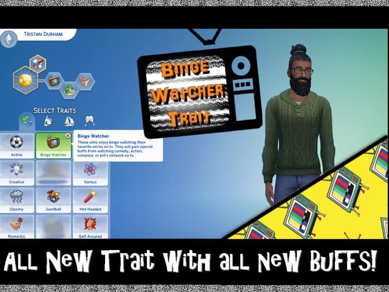 Woohoo! My first trait! This was a lot of fun to make, and I hope you all enjoy it as much as I do. It’s a pretty simple one, a hobby type(the picture shows the wrong category sorry. Didn’t want to re-do that screenshot after I fixed it! lol). Basically sims with the Binge Watcher trait really enjoy watching TV–Action, Romance, Comedy, or Kid’s channels to be precise.