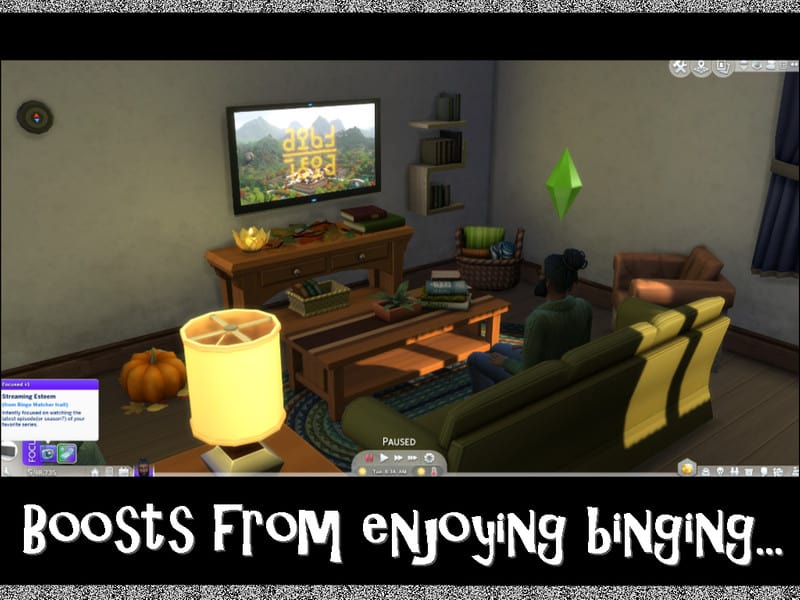 –&Streaming Esteem&buff adds +1 Focus while watching the channels mentioned above. Everyone knows how concentrated you can get while watching a really intense series! This buff goes away once the sim is done watching TV.