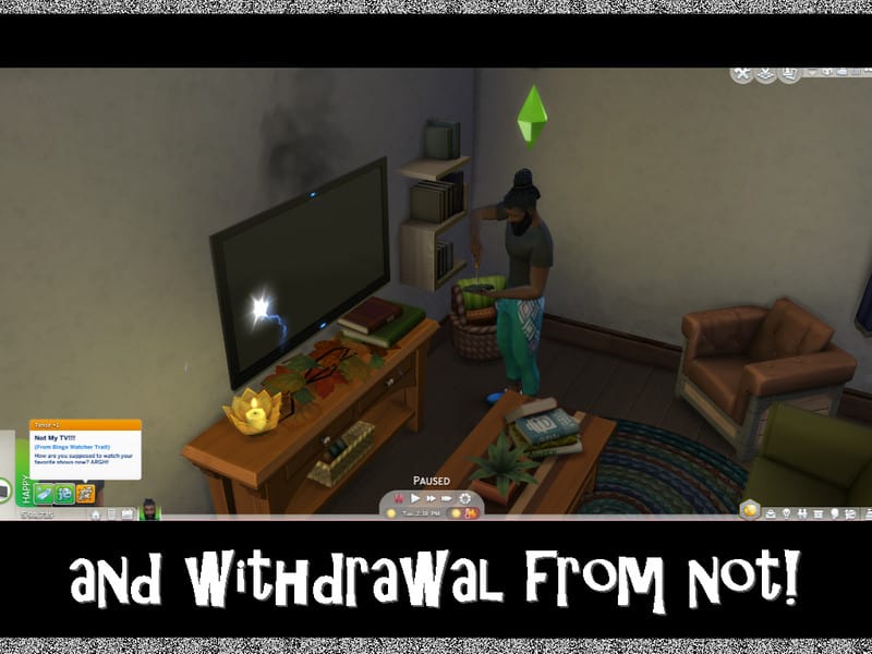–&Not My TV!!!& buff adds +1 Tension while your sim is repairing their broken television set. A broken TV is terrible for anyone, but it’s an extreme tragedy for Binge Watchers.