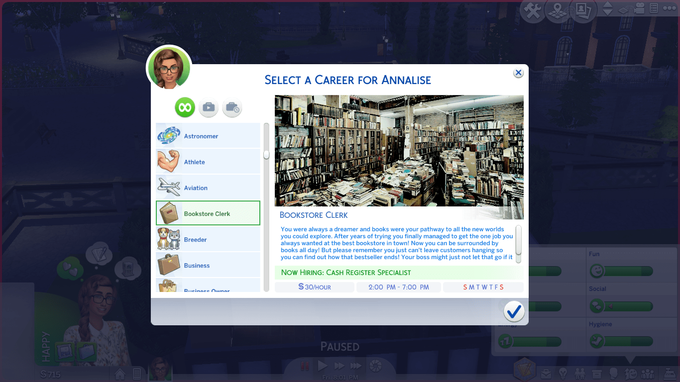 Hello again! I’m a huge book lover and my Writer Sim was in need of a part-time job to sustain her writing time.. so I was working on a career to help her when I remembered this career from S3! It was just what I needed so I pretty much remade it for Sims4. With a few changes here and there to flow better~