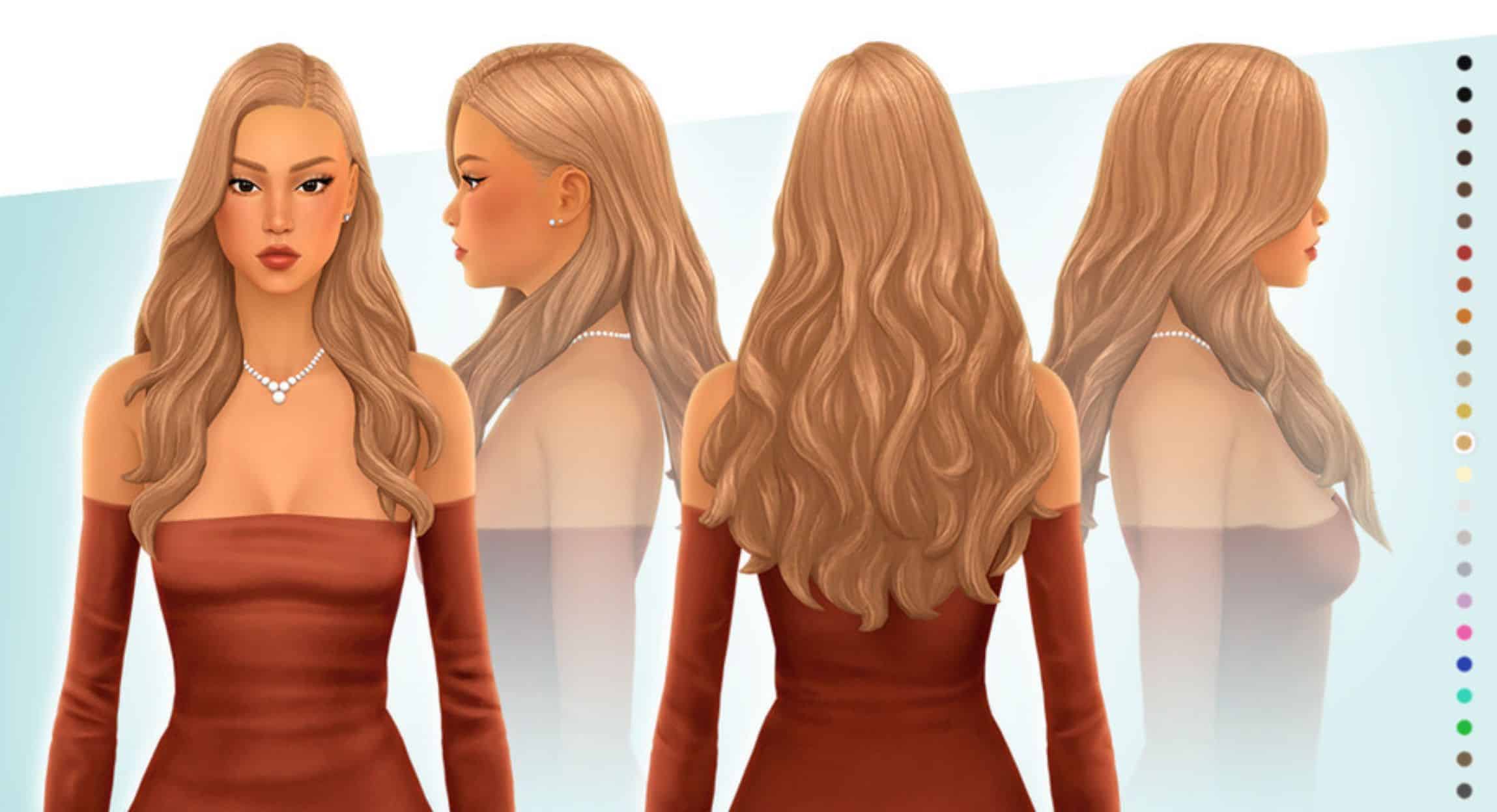 This long, wavy, side parted, alternate “Brielle Hairstyle” comes in the 24 EA hair colors, is hat compatible, and available for feminine framed Teen-Elder sims.