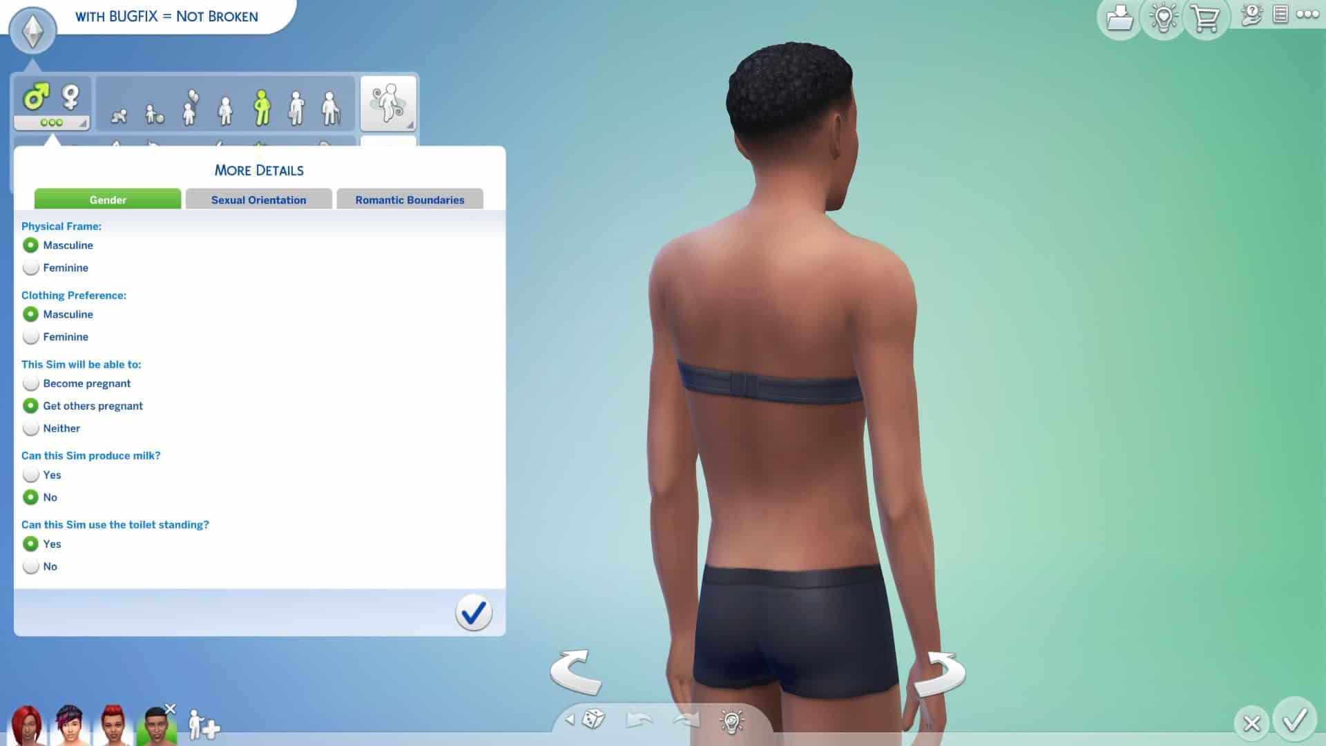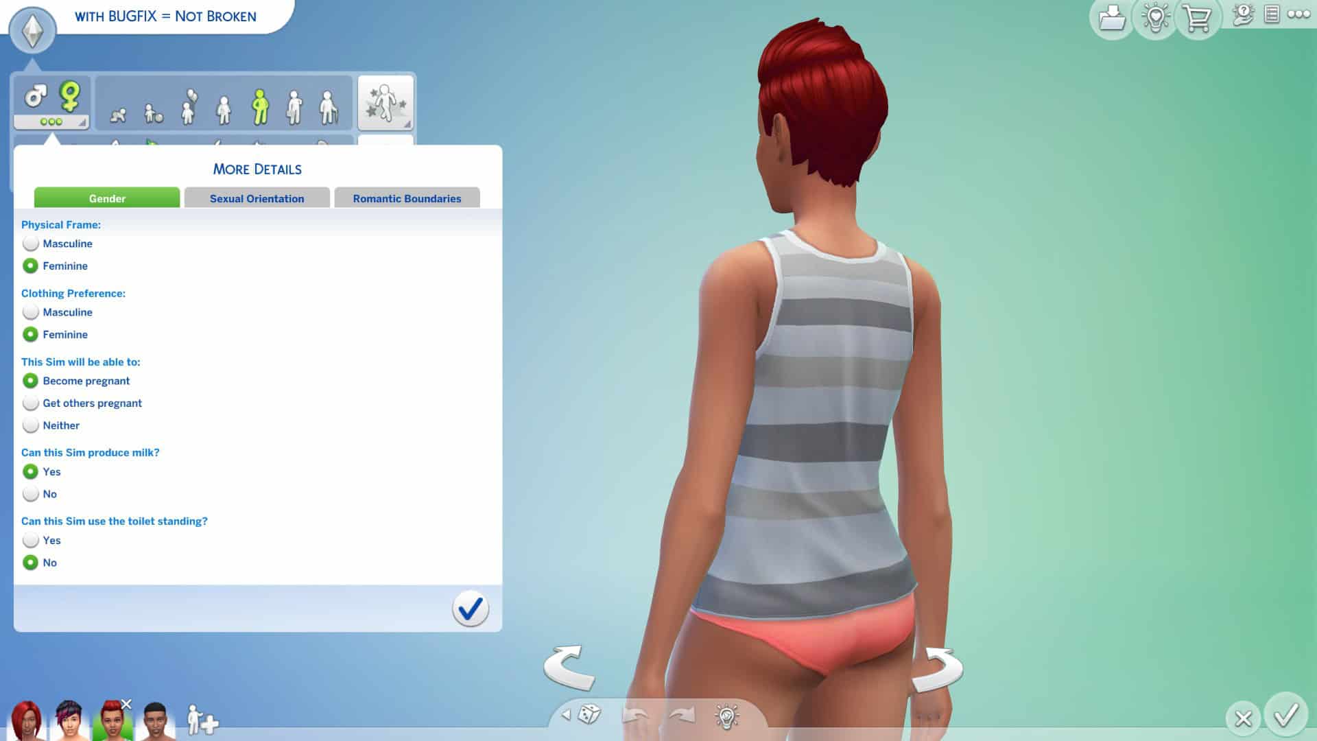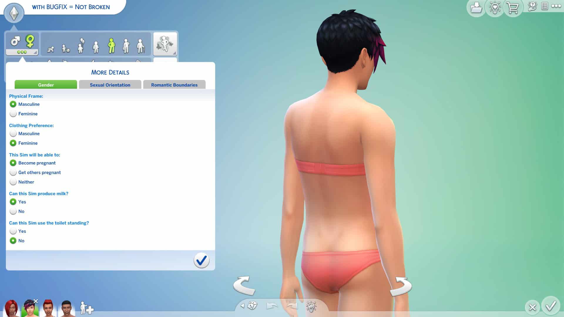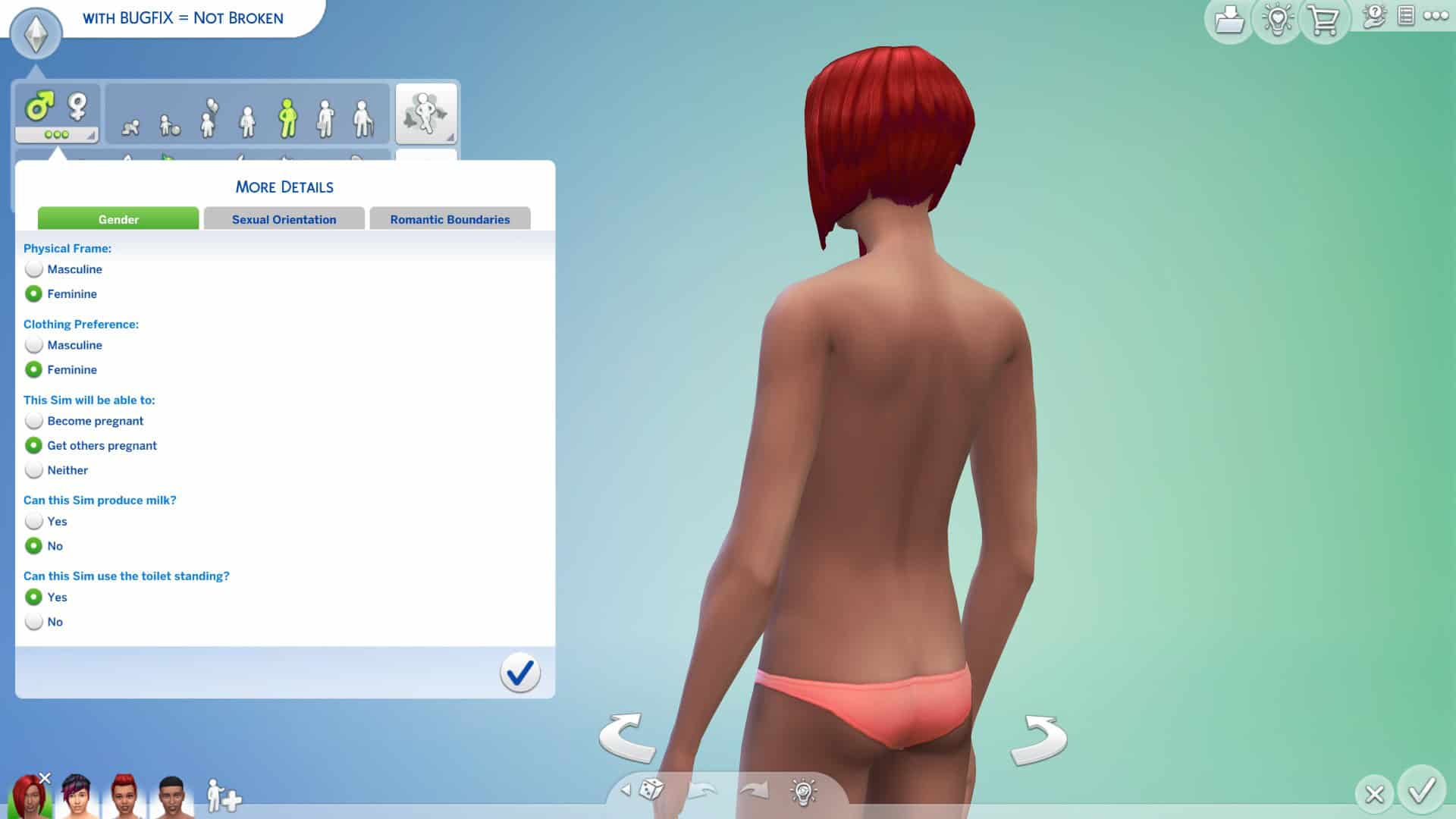 – Transframe sims will see it when nude or wearing “default” underwear and also when wearing clothing that was made for the opposite Physical Frame.