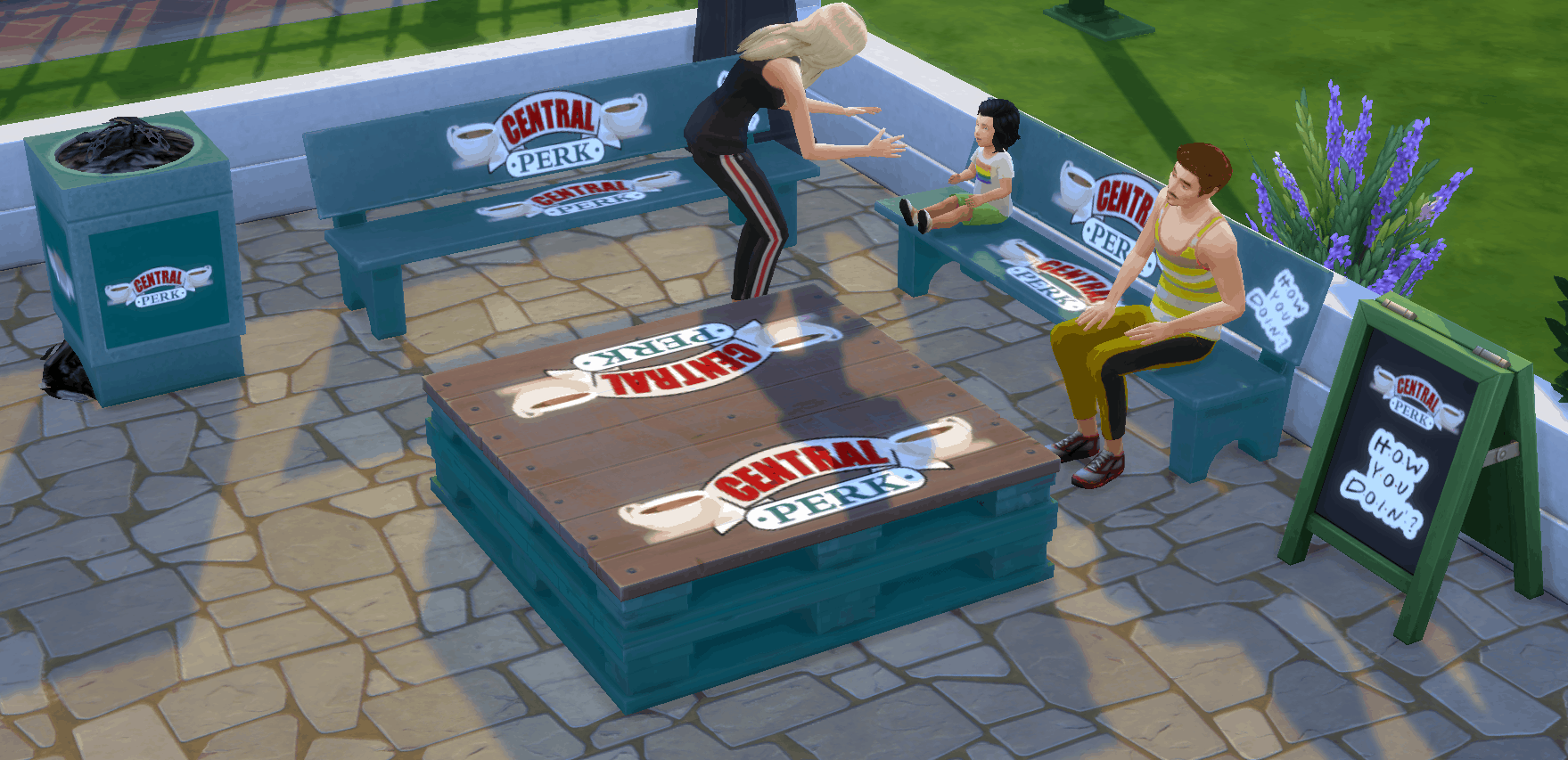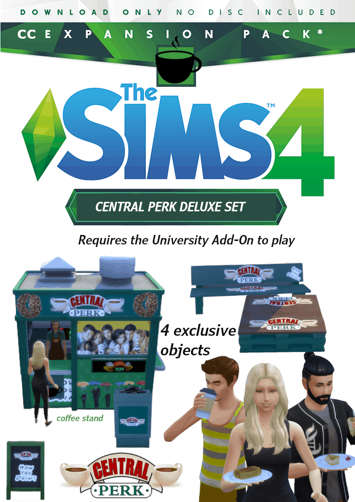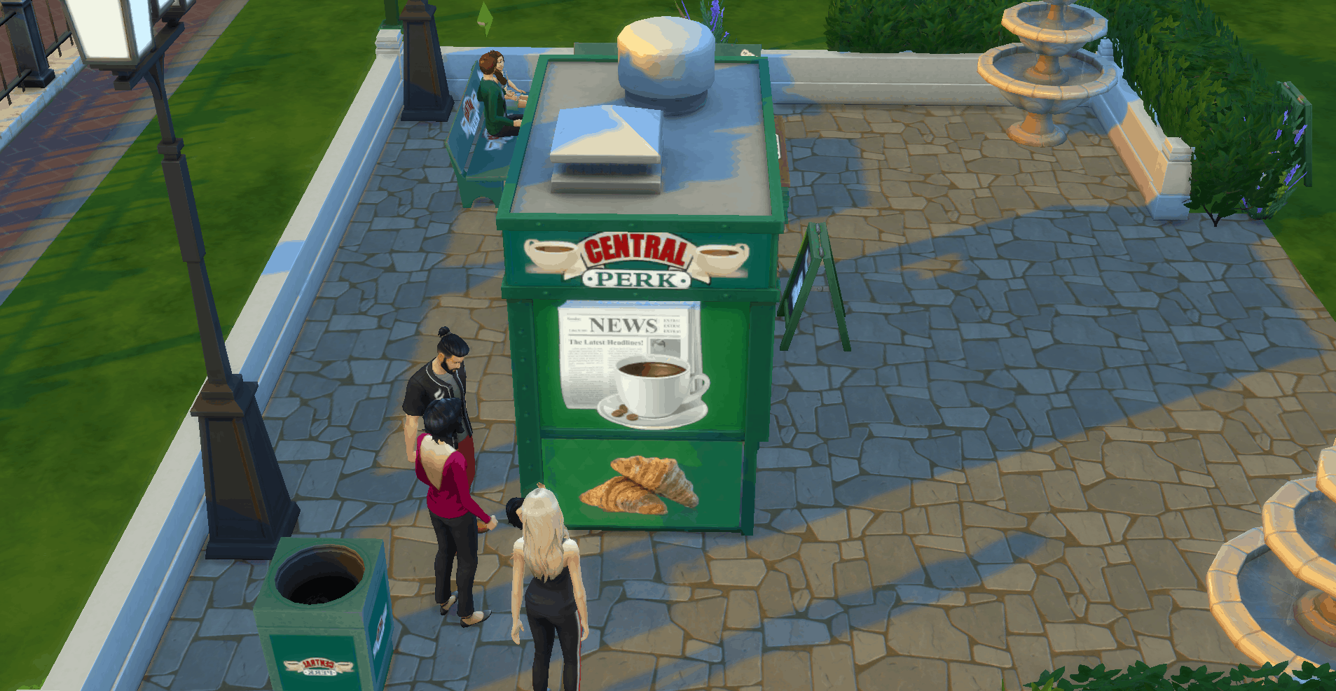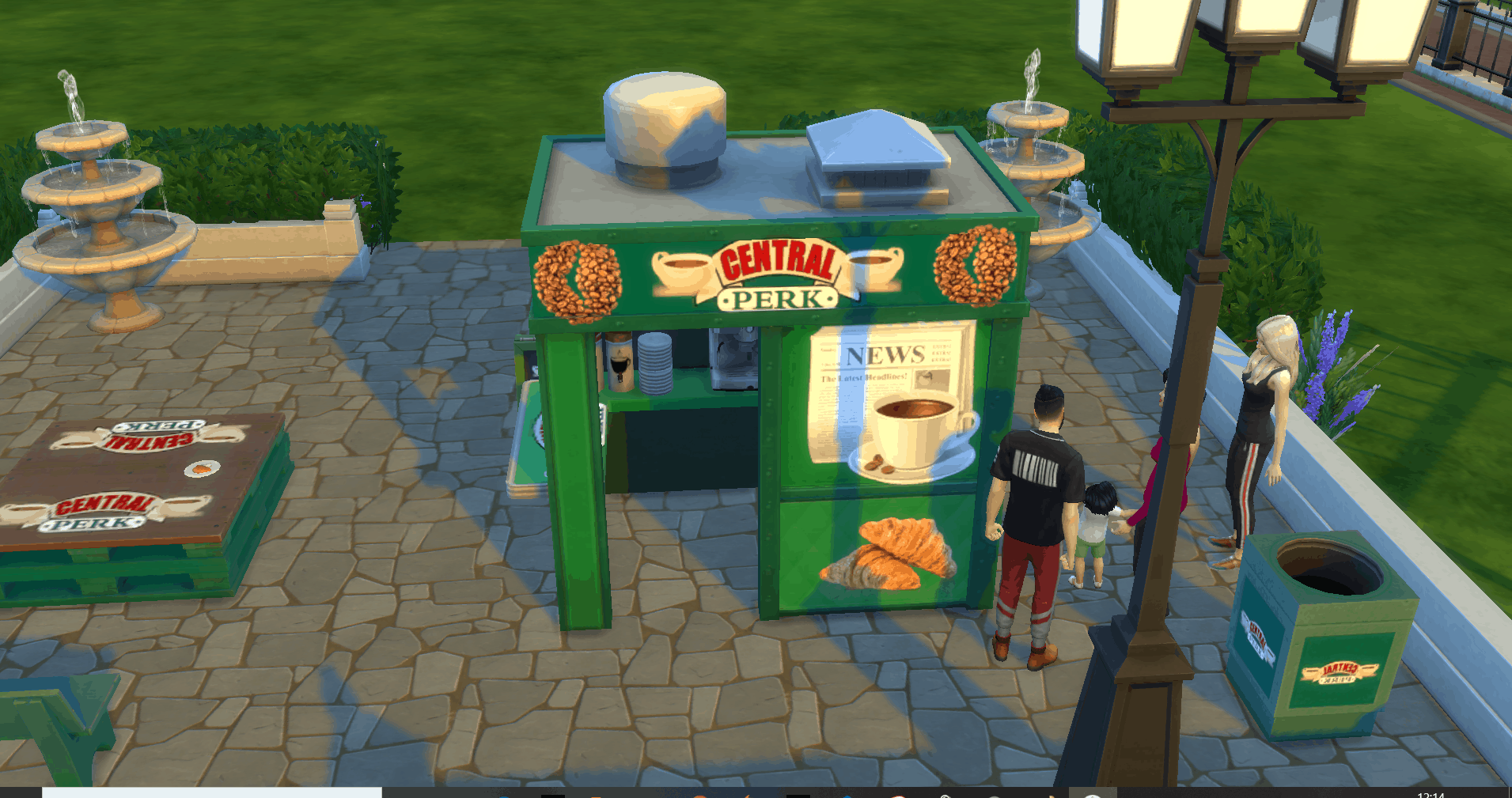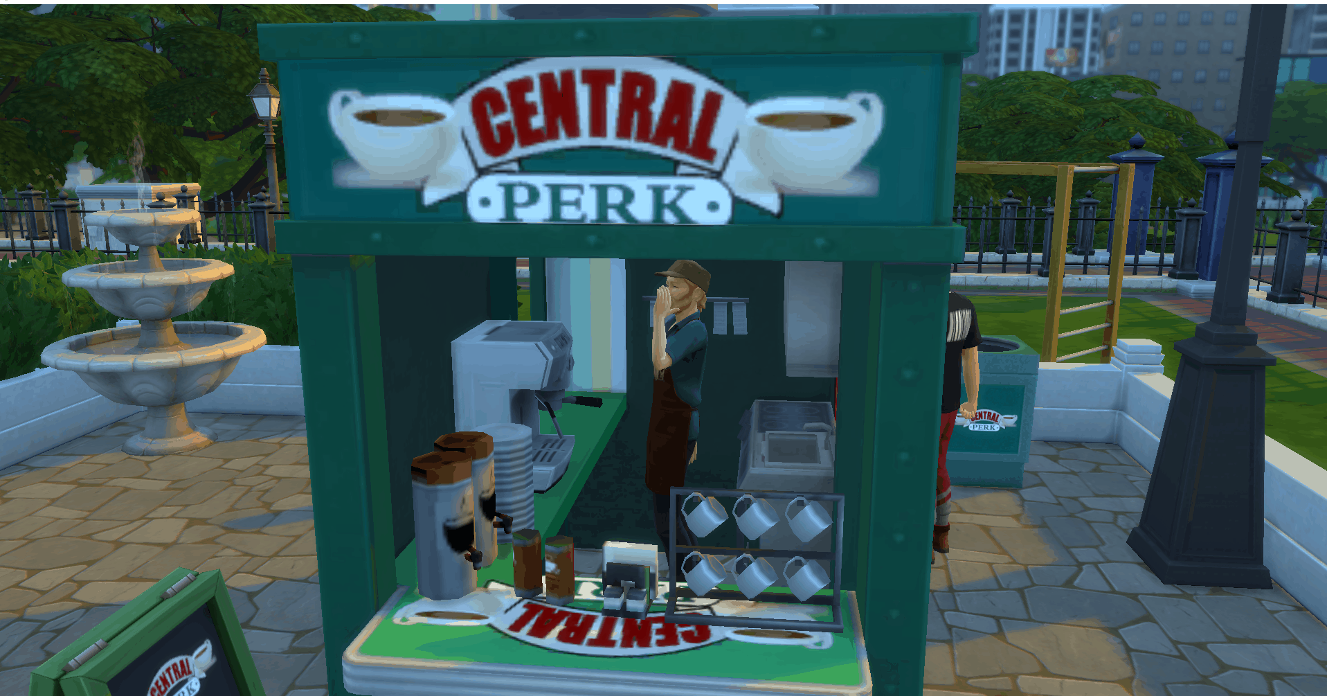 Buy coffee and cakes for your sims! Enjoy the little side park with coffee table, bench, bean and advertising board for your sims and his friends.