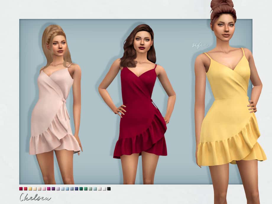 A cute, short wrap dress in 20 colors for teen, young adult and adult sims.