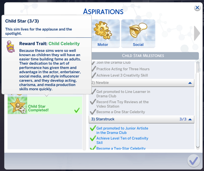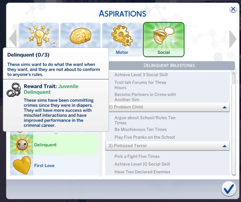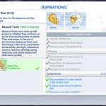 This set contains 4 different aspirations for your child sims: Perfect Angel, Little Einstien, Delinquent, and Child Star. Each aspiration seeks to utilize interactions added by various packs to give you new goals to accomplish with your sims. Fulfilling these aspirations will provide your sim with a custom reward trait that will boost their skill and career gains, among other benefits.