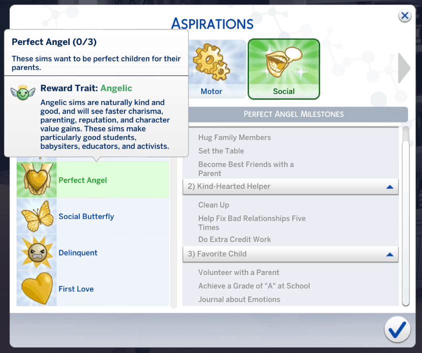 Perfect Angel: These sims want to be perfect children for their parents.
