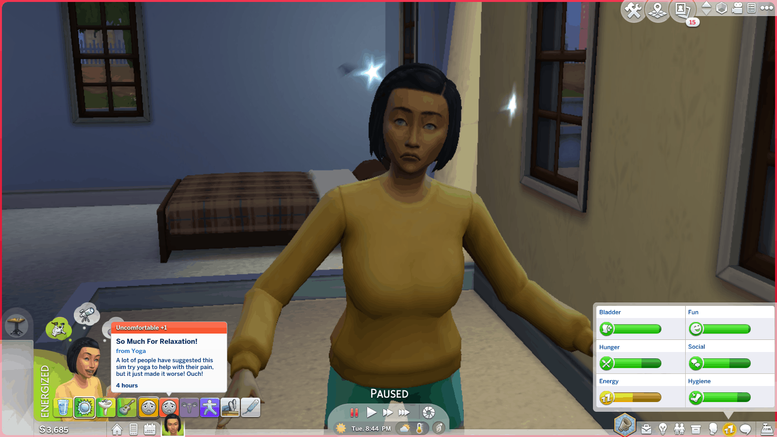 They have a chance of having uncomfortable moodlets for overdoing it when engaging in physical activity, having an upset stomach after eating, and having a painful reaction to yoga.