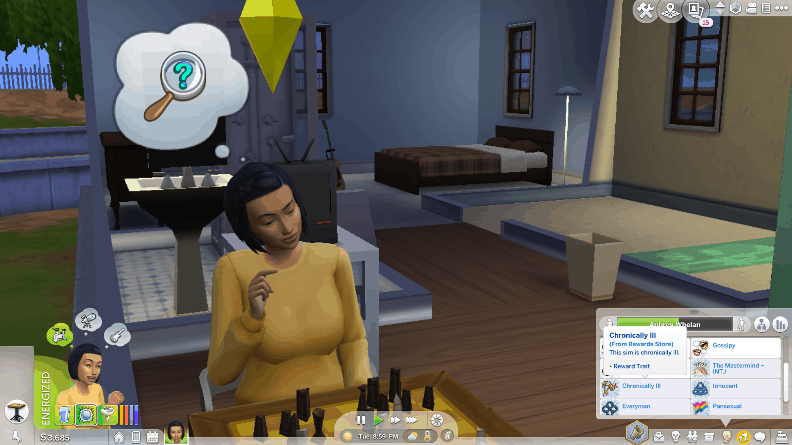 This is a trait that simulates life with a chronic illness. It is a reward trait, so it does not take up one of the three personality trait spots. Teens through elders can buy it from the rewards store for 100 points.