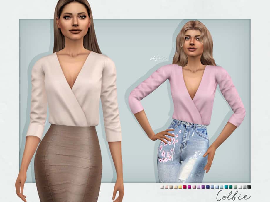 A silk wrap blouse available in 20 colors for teen, young adult and adult sims.