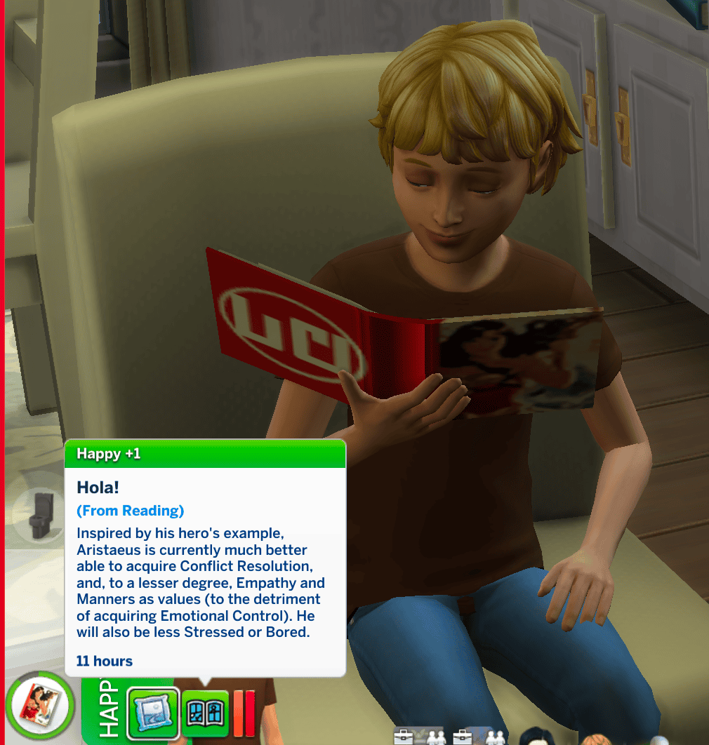 Although they have a variety of effects for readers of various ages, these custom (superhero comic) books for your Sims to read are, first and foremost, designed make it easier for children (and teens) to acquire the five Character Values. Each is only §5 and can be found under the Children’s Genre (for convenience) as well as other Genres appropriate to their subjects.
